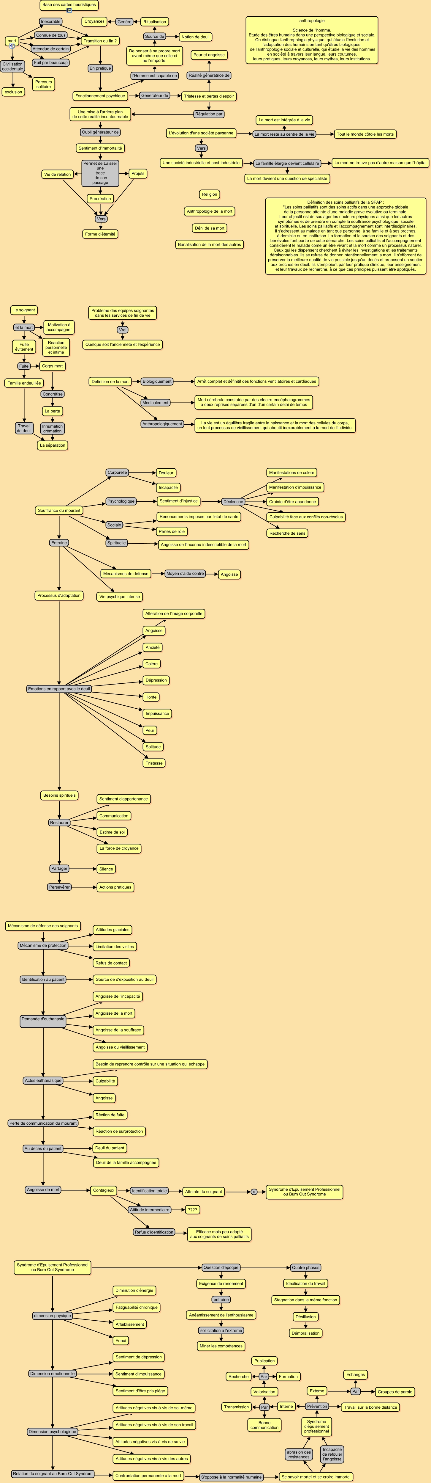 Cette carte de concepts créée avec IHMC CmapTools traite de: La mort-Les Soins Palliatifs, mort Inexorable Transition ou fin ?, Processus d'adaptation Emotions en rapport avec le deuil Colère, Valorisation Par Recherche, Interne Par Transmission, mort Fuit par beaucoup Transition ou fin ?, Mécanisme de défense des soignants Au décès du patient Deuil de la famille accompagnée, Mécanisme de défense des soignants Actes euthanasique Besoin de reprendre contrôle sur une situation qui échappe, Souffrance du mourant Corporelle Incapacité, Tristesse et pertes d'espoir Régulation par Une mise à l'arrière plan de cette réalité incontournable, Syndrome d'Epuisement Professionnel ou Burn Out Syndrome Dimension émotionnelle Sentiment d'être pris piège, Sentiment d'immortalité Permet de Laisser une trace de son passage Vie de relation, Tristesse et pertes d'espoir Réalité génératrice de Peur et angoisse, Sentiment d'immortalité Permet de Laisser une trace de son passage Procréation, Sentiment d'injustice Déclenche Manifestations de colère, Mécanisme de défense des soignants Mécanisme de protection Limitation des visites, Souffrance du mourant Spirituelle Angoisse de l'inconnu indescriptible de la mort, Mécanisme de défense des soignants Actes euthanasique Culpabilité, Problème des équipes soignantes dans les services de fin de vie Vrai Quelque soit l'ancienneté et l'expérience, Contagieux Attitude intermédiaire ????, Processus d'adaptation Emotions en rapport avec le deuil Angoisse