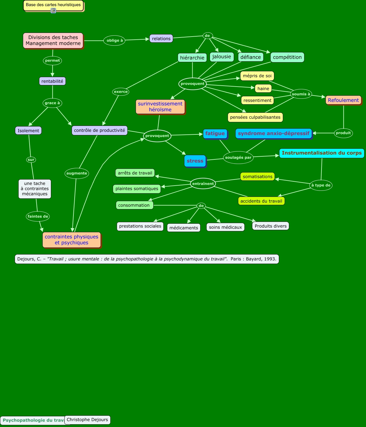 Cette carte de concepts créée avec IHMC CmapTools traite de: Psychopathologie du travail, stress soulagés par Instrumentalisation du corps, ressentiment soumis à Refoulement, compétition provoquent pensées culpabilisantes, haine soumis à Refoulement, surinvestissement héroïsme provoquent fatigue, accidents du travail entraînent plaintes somatiques, contrôle de productivité provoquent stress, Refoulement produit syndrome anxio-dépressif, jalousie provoquent mépris de soi, relations de jalousie, Divisions des taches Management moderne oblige à relations, consommation de médicaments, défiance provoquent mépris de soi, Instrumentalisation du corps à type de accidents du travail, accidents du travail entraînent arrêts de travail, somatisations entraînent consommation, jalousie provoquent ressentiment, compétition provoquent surinvestissement héroïsme, rentabilité grace à contrôle de productivité, syndrome anxio-dépressif soulagés par Instrumentalisation du corps