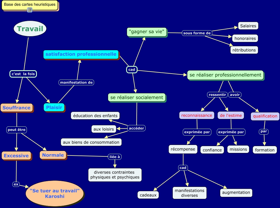 Cette carte de concepts créée avec IHMC CmapTools traite de: Travail, récompense cad cadeaux, Travail c'est la fois Plaisir, satisfaction professionnelle cad se réaliser socialement, satisfaction professionnelle cad se réaliser professionnellement, Excessive ex "Se tuer au travail" Karoshi, Souffrance peut être Excessive, de l'estime exprimée par missions, se réaliser socialement accéder aux loisirs, Souffrance peut être Normale, Normale liée à diverses contraintes physiques et psychiques, de l'estime exprimée par confiance, se réaliser socialement accéder aux biens de consommation, "gagner sa vie" sous forme de rétributions, qualification par formation, récompense cad augmentation, se réaliser socialement accéder éducation des enfants, "gagner sa vie" sous forme de Salaires, reconnaissance exprimée par récompense, satisfaction professionnelle cad "gagner sa vie", se réaliser professionnellement ressentir de l'estime