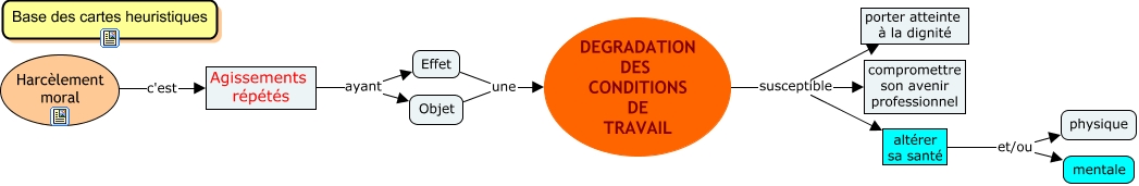 Cette carte de concepts créée avec IHMC CmapTools traite de: harcelement2, DEGRADATION DES CONDITIONS DE TRAVAIL susceptible porter atteinte à la dignité, Agissements répétés ayant Effet, Agissements répétés ayant Objet, Effet une DEGRADATION DES CONDITIONS DE TRAVAIL, altérer sa santé et/ou physique, Harcèlement moral c'est Agissements répétés, DEGRADATION DES CONDITIONS DE TRAVAIL susceptible compromettre son avenir professionnel, altérer sa santé et/ou mentale, Objet une DEGRADATION DES CONDITIONS DE TRAVAIL, DEGRADATION DES CONDITIONS DE TRAVAIL susceptible altérer sa santé