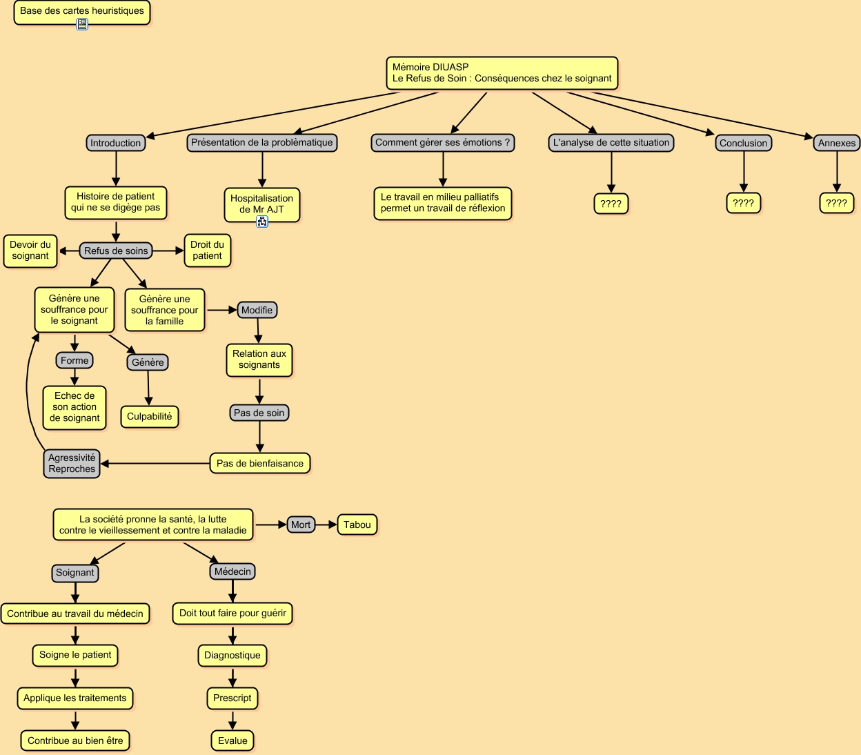 Cette carte de concepts créée avec IHMC CmapTools traite de: ResumeMemoireDIUASP, La société pronne la santé, la lutte contre le vieillessement et contre la maladie Soignant Contribue au travail du médecin, La société pronne la santé, la lutte contre le vieillessement et contre la maladie Médecin Evalue, La société pronne la santé, la lutte contre le vieillessement et contre la maladie Soignant Soigne le patient, Pas de bienfaisance Agressivité Reproches Génère une souffrance pour le soignant, Histoire de patient qui ne se digège pas Refus de soins Droit du patient, La société pronne la santé, la lutte contre le vieillessement et contre la maladie Soignant Applique les traitements, La société pronne la santé, la lutte contre le vieillessement et contre la maladie Médecin Doit tout faire pour guérir, La société pronne la santé, la lutte contre le vieillessement et contre la maladie Médecin Prescript, Mémoire DIUASP Le Refus de Soin : Conséquences chez le soignant Annexes ????, Mémoire DIUASP Le Refus de Soin : Conséquences chez le soignant Introduction Histoire de patient qui ne se digège pas, Mémoire DIUASP Le Refus de Soin : Conséquences chez le soignant Conclusion ????, Génère une souffrance pour la famille Modifie Relation aux soignants, La société pronne la santé, la lutte contre le vieillessement et contre la maladie Médecin Diagnostique, Génère une souffrance pour le soignant Génère Culpabilité, La société pronne la santé, la lutte contre le vieillessement et contre la maladie Mort Tabou, Histoire de patient qui ne se digège pas Refus de soins Génère une souffrance pour le soignant, Histoire de patient qui ne se digège pas Refus de soins Devoir du soignant, La société pronne la santé, la lutte contre le vieillessement et contre la maladie Soignant Contribue au bien être, Mémoire DIUASP Le Refus de Soin : Conséquences chez le soignant Comment gérer ses émotions ? Le travail en milieu palliatifs permet un travail de réflexion, Génère une souffrance pour le soignant Forme Echec de son action de soignant
