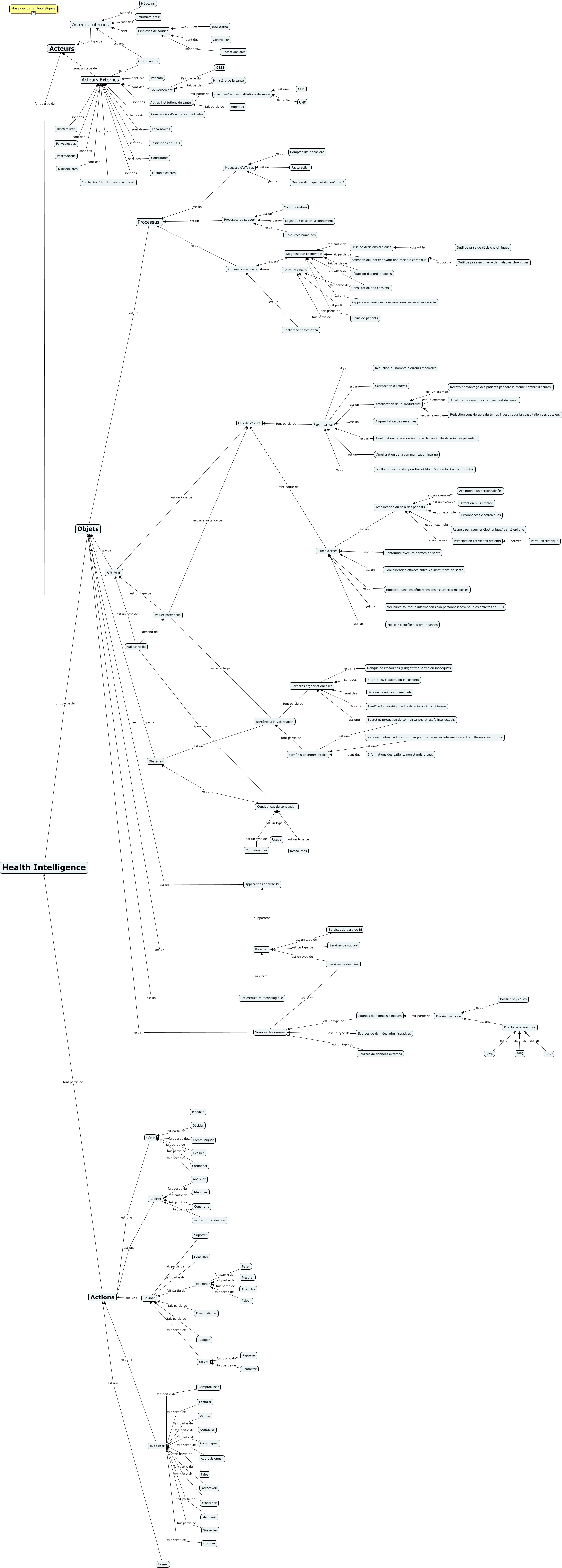 Cette carte de concepts créée avec IHMC CmapTools traite de: TEST ACTION ACTEUR OBJET, Secret et protection de connaissances et actifs intellectuels est une Barrières environmentales, Outil de prise de décisions cliniques support la Prise de décisions cliniques, Prise de décisions cliniques fait partie de Diagnostique et thérapie, Comptabiliser fait partie de supporter, Objets font partie de Health Intelligence, Faire fait partie de supporter, Palper fait partie de Examiner, Amélioration de la communication interne est un Flux internes, CSSS Fait partie du Gouvernement, Cordonner fait partie de Gérer, Améliorer vraiment le cheminement du travail est un exemple Amélioration de la productivité, Satisfaction au travail est un Flux internes, Attention aux patient ayant une maladie chronique fait partie de Diagnostique et thérapie, Rappels par courrier électronique/ par télephone est un exemple Amélioration du soin des patients, SI en silos, désuets, ou inexistants sont des Barrières organisationnelles, Ministère de la santé fait partie u Gouvernement, UMF est une Cliniques/petites institutions de santé, Réceptionnistes sont des Employés de soutien, Valuer potentielle est un type de Valeur, Flux externes font partie de Flux de valeurs