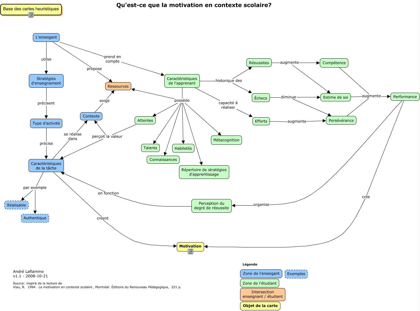 Cette carte de concepts créée avec IHMC CmapTools traite de: La motivation v1.1, Caractéristiques de la tâche par exemple Réalisable, Caractéristiques de la tâche créent Motivation, Caractéristiques de la tâche se réalise dans Contexte, Caractéristiques de l'apprenant possède Habiletés, Réeussites augmente Compétence, Caractéristiques de l'apprenant possède Talents, Caractéristiques de l'apprenant historique des Réeussites, Échecs diminue Estime de soi, L'enseigant propose Ressources, Caractéristiques de l'apprenant capacité à réaliser Efforts, L'enseigant prend en compte Caractéristiques de l'apprenant, Caractéristiques de l'apprenant possède Ressources, Performance organise Perception du degré de réeussite, Persévérance augmente Performance, Caractéristiques de l'apprenant possède Attentes, Type d'activité précise Caractéristiques de la tâche, Compétence augmente Performance, Caractéristiques de la tâche par exemple Authentique, Attentes perçoit la valeur Caractéristiques de la tâche, Efforts augmente Persévérance