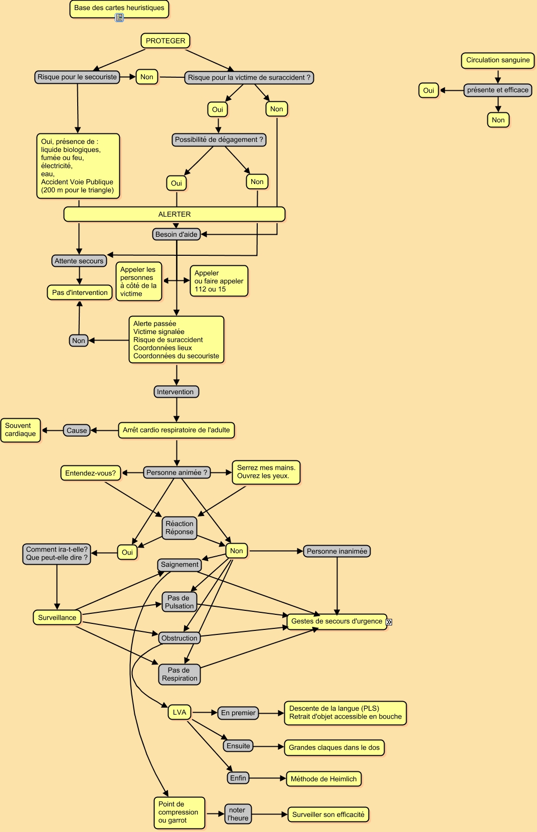 Cette carte de concepts créée avec IHMC CmapTools traite de: GSU-GesteDeSecoursEtDUrgence, Arrêt cardio respiratoire de l'adulte Cause Souvent cardiaque, PROTEGER Risque pour le secouriste Oui, présence de : liquide biologiques, fumée ou feu, électricité, eau, Accident Voie Publique (200 m pour le triangle), Arrêt cardio respiratoire de l'adulte Personne animée ? Entendez-vous?, Arrêt cardio respiratoire de l'adulte Personne animée ? Serrez mes mains. Ouvrez les yeux., Non Attente secours Pas d'intervention, Surveillance Obstruction LVA, Surveillance Obstruction SECOURIR, Surveillance Pas de Pulsation SECOURIR, Serrez mes mains. Ouvrez les yeux. Réaction Réponse Non, Non Risque pour la victime de suraccident ? Non, LVA En premier Descente de la langue (PLS) Retrait d'objet accessible en bouche, Non Obstruction SECOURIR, Surveillance Saignement SECOURIR, LVA Ensuite Grandes claques dans le dos, Non Besoin d'aide Alerte passée Victime signalée Risque de suraccident Coordonnées lieux Coordonnées du secouriste, ALERTER Besoin d'aide Appeler les personnes à côté de la victime, Non Pas de Respiration SECOURIR, ALERTER Besoin d'aide Appeler ou faire appeler 112 ou 15, Non Saignement SECOURIR, Circulation sanguine présente et efficace Non