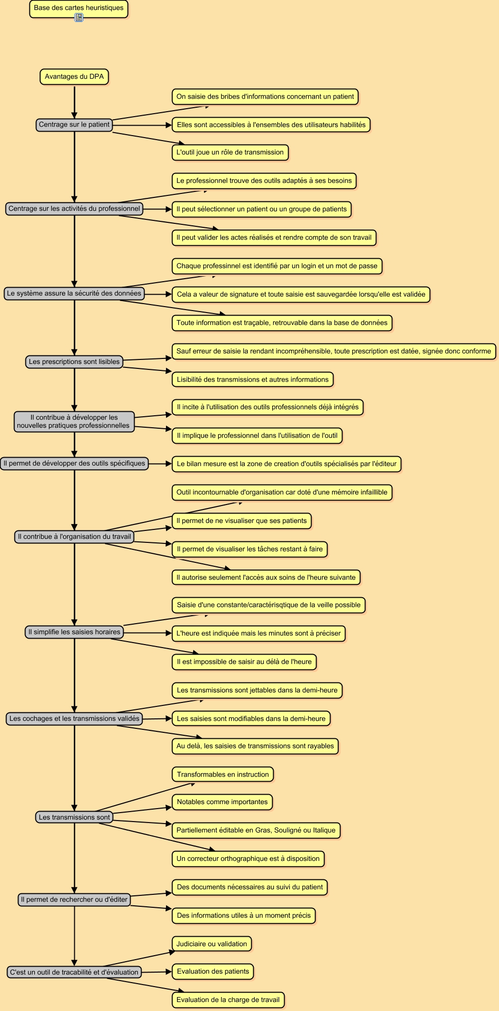 Cette carte de concepts créée avec IHMC CmapTools traite de: DPA-Avantages, Avantages du DPA Il contribue à l'organisation du travail Il permet de visualiser les tâches restant à faire, Avantages du DPA Centrage sur le patient On saisie des bribes d'informations concernant un patient, Avantages du DPA Centrage sur les activités du professionnel Le professionnel trouve des outils adaptés à ses besoins, Avantages du DPA Les transmissions sont Notables comme importantes, Avantages du DPA Les cochages et les transmissions validés Les saisies sont modifiables dans la demi-heure, Avantages du DPA Les cochages et les transmissions validés Au delà, les saisies de transmissions sont rayables, Avantages du DPA Il contribue à l'organisation du travail Il permet de ne visualiser que ses patients, Avantages du DPA Il contribue à développer les nouvelles pratiques professionnelles Il implique le professionnel dans l'utilisation de l'outil, Avantages du DPA Le système assure la sécurité des données Chaque professinnel est identifié par un login et un mot de passe, Avantages du DPA Les cochages et les transmissions validés Les transmissions sont jettables dans la demi-heure, Avantages du DPA Il contribue à l'organisation du travail Il permet de visualiser les tâches restant à faire, Avantages du DPA Il contribue à développer les nouvelles pratiques professionnelles Il incite à l'utilisation des outils professionnels déjà intégrés, Avantages du DPA Il contribue à l'organisation du travail Il autorise seulement l'accès aux soins de l'heure suivante, Avantages du DPA Le système assure la sécurité des données Toute information est traçable, retrouvable dans la base de données, Avantages du DPA Il permet de développer des outils spécifiques Le bilan mesure est la zone de creation d'outils spécialisés par l'éditeur, Avantages du DPA Il simplifie les saisies horaires Saisie d'une constante/caractérisqtique de la veille possible, Avantages du DPA C'est un outil de tracabilité et d'évaluation Evaluation des patients, Avantages du DPA Les transmissions sont Partiellement éditable en Gras, Souligné ou Italique, Avantages du DPA Le système assure la sécurité des données Cela a valeur de signature et toute saisie est sauvegardée lorsqu'elle est validée, Avantages du DPA Il contribue à l'organisation du travail Il permet de ne visualiser que ses patients