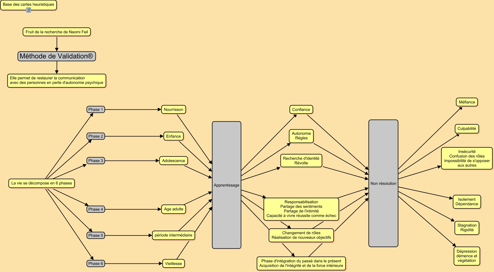 Cette carte de concepts créée avec IHMC CmapTools traite de: Méthode de Validation® - Etapes de la vie - Naomi Feil, Age adulte Apprentissage Confiance, Confiance Non résolution Dépression démence et végétation, Adolescence Apprentissage Changement de rôles Réalisation de nouveaux objectifs, Phase d'intégration du passé dans le présent Acquisition de l'intégrité et de la force intérieure Non résolution Insécurité Confusion des rôles Impossibilité de s'opposer aux autres, La vie se décompose en 6 phases Phase 4 Age adulte, Vieillesse Apprentissage Responsabilisation Partage des sentiments Partage de l'intimité Capacité à vivre réussite comme échec, Responsabilisation Partage des sentiments Partage de l'intimité Capacité à vivre réussite comme échec Non résolution Méfiance, Recherche d'identité Révolte Non résolution Dépression démence et végétation, Enfance Apprentissage Responsabilisation Partage des sentiments Partage de l'intimité Capacité à vivre réussite comme échec, La vie se décompose en 6 phases Phase 1 Nourrisson, Responsabilisation Partage des sentiments Partage de l'intimité Capacité à vivre réussite comme échec Non résolution Culpabilité, La vie se décompose en 6 phases Phase 6 Vieillesse, Confiance Non résolution Culpabilité, Nourrisson Apprentissage Confiance, Nourrisson Apprentissage Phase d'intégration du passé dans le présent Acquisition de l'intégrité et de la force intérieure, Recherche d'identité Révolte Non résolution Insécurité Confusion des rôles Impossibilité de s'opposer aux autres, Changement de rôles Réalisation de nouveaux objectifs Non résolution Méfiance, Confiance Non résolution Stagnation Rigidité, Changement de rôles Réalisation de nouveaux objectifs Non résolution Dépression démence et végétation, Phase d'intégration du passé dans le présent Acquisition de l'intégrité et de la force intérieure Non résolution Culpabilité