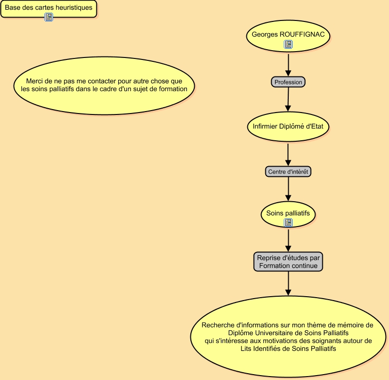 Cette carte de concepts créée avec IHMC CmapTools traite de: Attention_A_Lire_Attentivement, Infirmier Diplômé d'Etat Centre d'intérêt Soins palliatifs, Soins palliatifs Reprise d'études par Formation continue Recherche d'informations sur mon thème de mémoire de Diplôme Universitaire de Soins Palliatifs qui s'intéresse aux motivations des soignants autour de Lits Identifiés de Soins Palliatifs, Georges ROUFFIGNAC Profession Infirmier Diplômé d'Etat