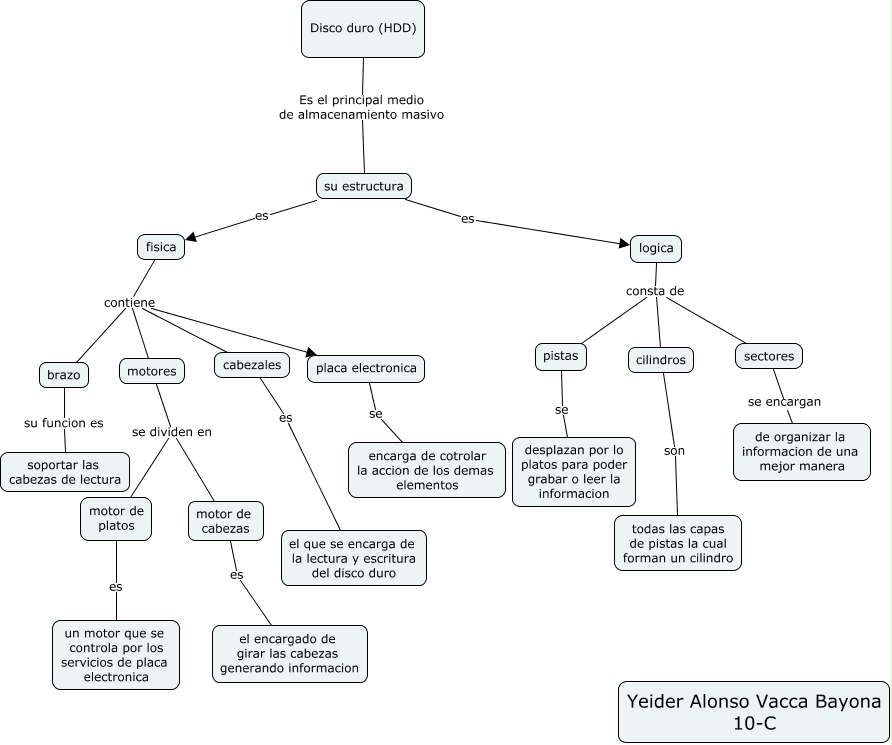 Este Cmap, tiene información relacionada con: HDD_Yeider Alonso Vacca Bayona, fisica contiene placa electronica, motores se dividen en motor de platos, pistas se desplazan por lo platos para poder grabar o leer la informacion, logica consta de pistas, motor de platos es un motor que se controla por los servicios de placa electronica, brazo su funcion es soportar las cabezas de lectura, motor de cabezas es el encargado de girar las cabezas generando informacion, cilindros son todas las capas de pistas la cual forman un cilindro, logica consta de sectores, sectores se encargan de organizar la informacion de una mejor manera, motores se dividen en motor de cabezas, logica consta de cilindros, cabezales es el que se encarga de la lectura y escritura del disco duro, su estructura es fisica, fisica contiene brazo, Disco duro (HDD) Es el principal medio de almacenamiento masivo su estructura, su estructura es logica, fisica contiene motores, placa electronica se encarga de cotrolar la accion de los demas elementos, fisica contiene cabezales