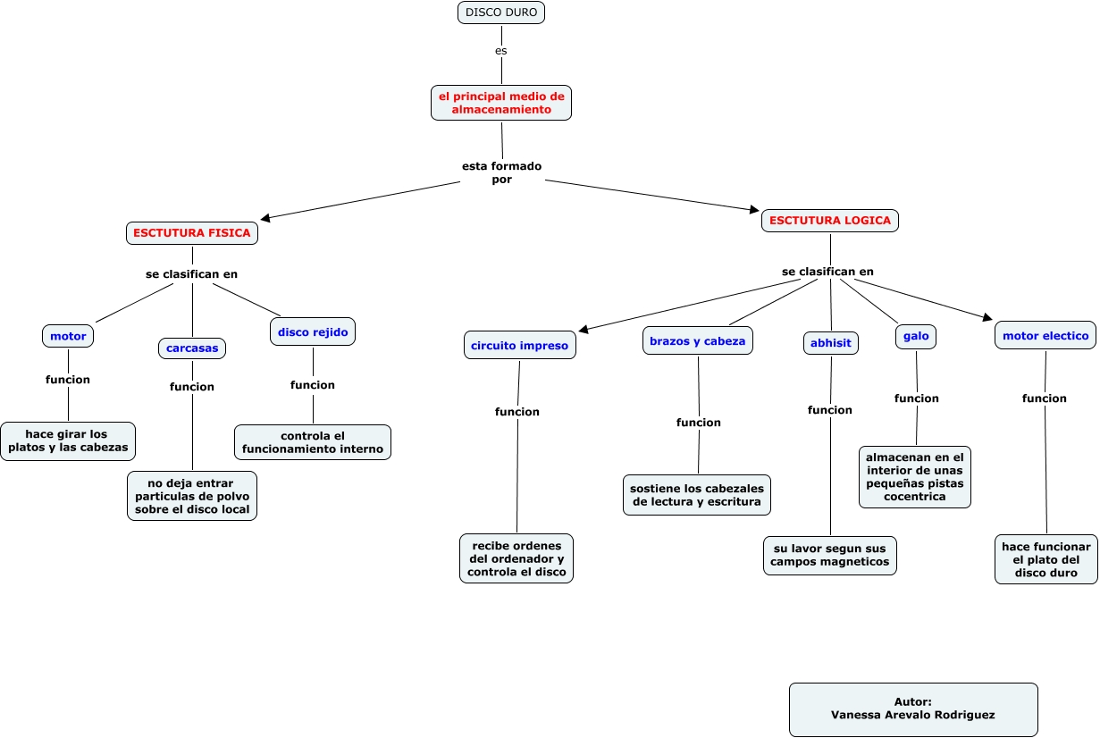 This Concept Map, created with IHMC CmapTools, has information related to: Mapa conceptual HDD_Vanessa Arevalo Rodriguez, motor electico funcion hace funcionar el plato del disco duro, ESCTUTURA LOGICA se clasifican en brazos y cabeza, motor funcion hace girar los platos y las cabezas, ESCTUTURA FISICA se clasifican en carcasas, brazos y cabeza funcion sostiene los cabezales de lectura y escritura, DISCO DURO es el principal medio de almacenamiento, galo funcion almacenan en el interior de unas pequeñas pistas cocentrica, ESCTUTURA LOGICA se clasifican en galo, el principal medio de almacenamiento esta formado por ESCTUTURA FISICA, carcasas funcion no deja entrar particulas de polvo sobre el disco local, ESCTUTURA LOGICA se clasifican en motor electico, ESCTUTURA FISICA se clasifican en disco rejido, abhisit funcion su lavor segun sus campos magneticos, ESCTUTURA FISICA se clasifican en motor, ESCTUTURA LOGICA se clasifican en abhisit, disco rejido funcion controla el funcionamiento interno, el principal medio de almacenamiento esta formado por ESCTUTURA LOGICA, circuito impreso funcion recibe ordenes del ordenador y controla el disco, ESCTUTURA LOGICA se clasifican en circuito impreso