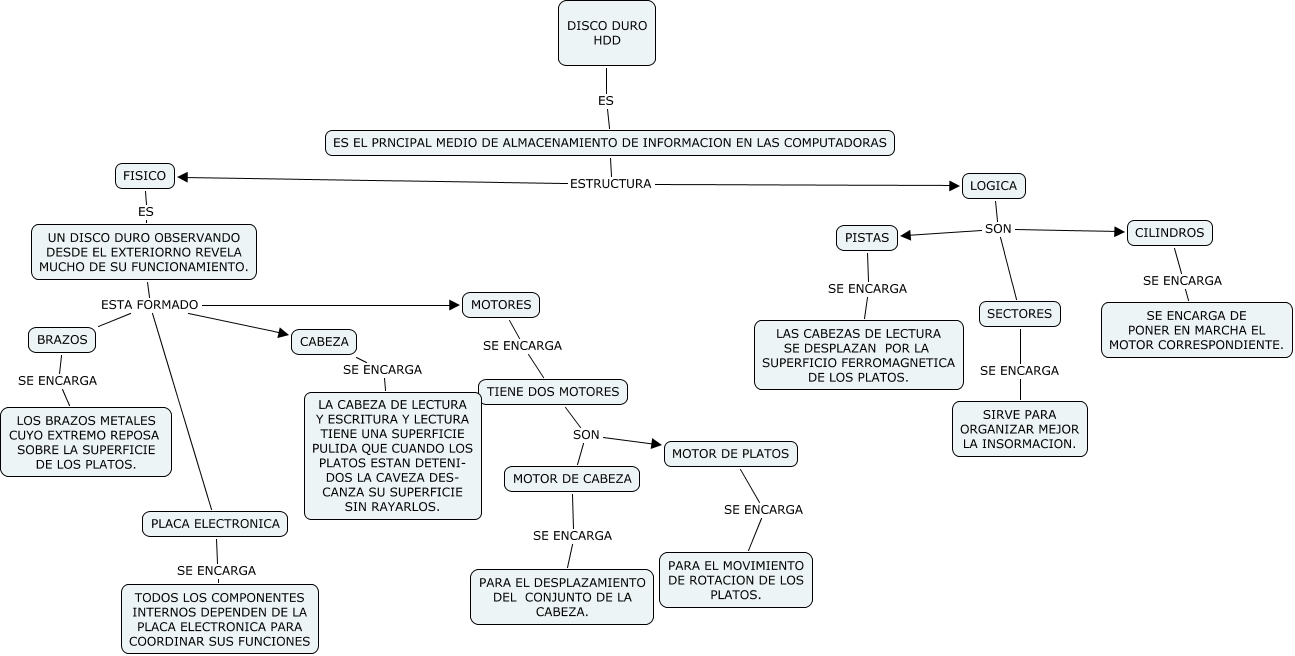 This Concept Map, created with IHMC CmapTools, has information related to: YARI-Cmaps, MOTORES SE ENCARGA TIENE DOS MOTORES, PLACA ELECTRONICA SE ENCARGA TODOS LOS COMPONENTES INTERNOS DEPENDEN DE LA PLACA ELECTRONICA PARA COORDINAR SUS FUNCIONES, DISCO DURO HDD ES ES EL PRNCIPAL MEDIO DE ALMACENAMIENTO DE INFORMACION EN LAS COMPUTADORAS, UN DISCO DURO OBSERVANDO DESDE EL EXTERIORNO REVELA MUCHO DE SU FUNCIONAMIENTO. ESTA FORMADO PLACA ELECTRONICA, TIENE DOS MOTORES SON MOTOR DE PLATOS, PISTAS SE ENCARGA LAS CABEZAS DE LECTURA SE DESPLAZAN POR LA SUPERFICIO FERROMAGNETICA DE LOS PLATOS., ES EL PRNCIPAL MEDIO DE ALMACENAMIENTO DE INFORMACION EN LAS COMPUTADORAS ESTRUCTURA LOGICA, BRAZOS SE ENCARGA LOS BRAZOS METALES CUYO EXTREMO REPOSA SOBRE LA SUPERFICIE DE LOS PLATOS., MOTOR DE CABEZA SE ENCARGA PARA EL DESPLAZAMIENTO DEL CONJUNTO DE LA CABEZA., SECTORES SE ENCARGA SIRVE PARA ORGANIZAR MEJOR LA INSORMACION., TIENE DOS MOTORES SON MOTOR DE CABEZA, LOGICA SON CILINDROS, UN DISCO DURO OBSERVANDO DESDE EL EXTERIORNO REVELA MUCHO DE SU FUNCIONAMIENTO. ESTA FORMADO CABEZA, FISICO ES UN DISCO DURO OBSERVANDO DESDE EL EXTERIORNO REVELA MUCHO DE SU FUNCIONAMIENTO., LOGICA SON SECTORES, CILINDROS SE ENCARGA SE ENCARGA DE PONER EN MARCHA EL MOTOR CORRESPONDIENTE., LOGICA SON PISTAS, CABEZA SE ENCARGA LA CABEZA DE LECTURA Y ESCRITURA Y LECTURA TIENE UNA SUPERFICIE PULIDA QUE CUANDO LOS PLATOS ESTAN DETENI- DOS LA CAVEZA DES- CANZA SU SUPERFICIE SIN RAYARLOS., ES EL PRNCIPAL MEDIO DE ALMACENAMIENTO DE INFORMACION EN LAS COMPUTADORAS ESTRUCTURA FISICO, MOTOR DE PLATOS SE ENCARGA PARA EL MOVIMIENTO DE ROTACION DE LOS PLATOS.