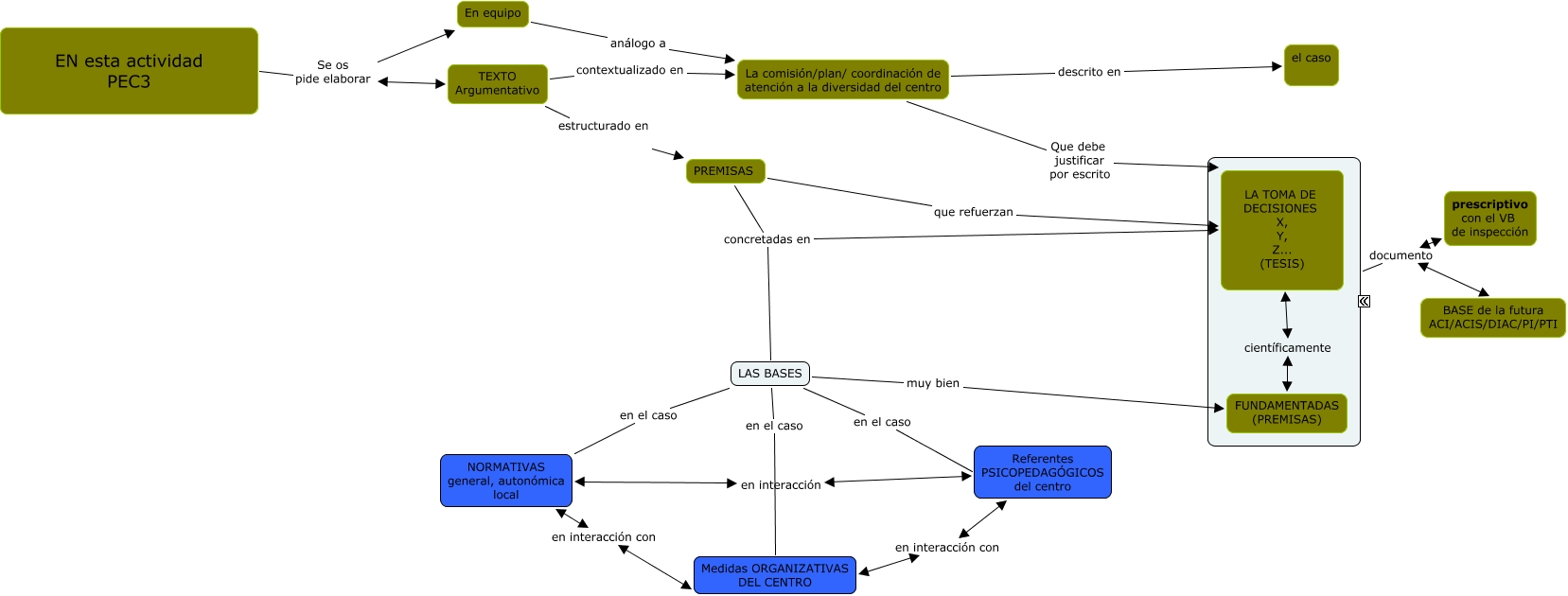 Aquest mapa conceptual conté informació relacionada amb: PEC3-Argumenta(v3.cast), PREMISAS que refuerzan LA TOMA DE DECISIONES X, Y, Z... (TESIS), LAS BASES en el caso NORMATIVAS general, autonómica local, ???? documento BASE de la futura ACI/ACIS/DIAC/PI/PTI, LAS BASES en el caso Referentes PSICOPEDAGÓGICOS del centro, La comisión/plan/ coordinación de atención a la diversidad del centro Que debe justificar por escrito LA TOMA DE DECISIONES X, Y, Z... (TESIS), La comisión/plan/ coordinación de atención a la diversidad del centro descrito en el caso, En equipo análogo a La comisión/plan/ coordinación de atención a la diversidad del centro, Referentes PSICOPEDAGÓGICOS del centro en interacción con Medidas ORGANIZATIVAS DEL CENTRO, PREMISAS concretadas en LA TOMA DE DECISIONES X, Y, Z... (TESIS), LAS BASES en el caso Medidas ORGANIZATIVAS DEL CENTRO, NORMATIVAS general, autonómica local en interacción Referentes PSICOPEDAGÓGICOS del centro, EN esta actividad PEC3 Se os pide elaborar En equipo, FUNDAMENTADAS (PREMISAS) científicamente LA TOMA DE DECISIONES X, Y, Z... (TESIS), EN esta actividad PEC3 Se os pide elaborar TEXTO Argumentativo, TEXTO Argumentativo contextualizado en La comisión/plan/ coordinación de atención a la diversidad del centro, NORMATIVAS general, autonómica local en interacción con Medidas ORGANIZATIVAS DEL CENTRO, ???? documento prescriptivo con el VB de inspección, TEXTO Argumentativo estructurado en PREMISAS, LAS BASES muy bien FUNDAMENTADAS (PREMISAS), PREMISAS concretadas en LAS BASES
