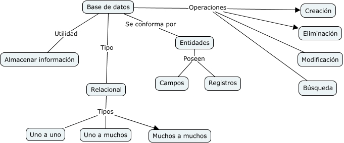 Este Cmap, tiene información relacionada con: Incinga-Alvarado-Contino, Base de datos Operaciones Modificación, Relacional Tipos Uno a muchos, Relacional Tipos Uno a uno, Base de datos Operaciones Eliminación, Base de datos Tipo Relacional, Entidades Poseen Registros, Base de datos Utilidad Almacenar información, Relacional Tipos Muchos a muchos, Base de datos Operaciones Búsqueda, Base de datos Se conforma por Entidades, Entidades Poseen Campos, Base de datos Operaciones Creación