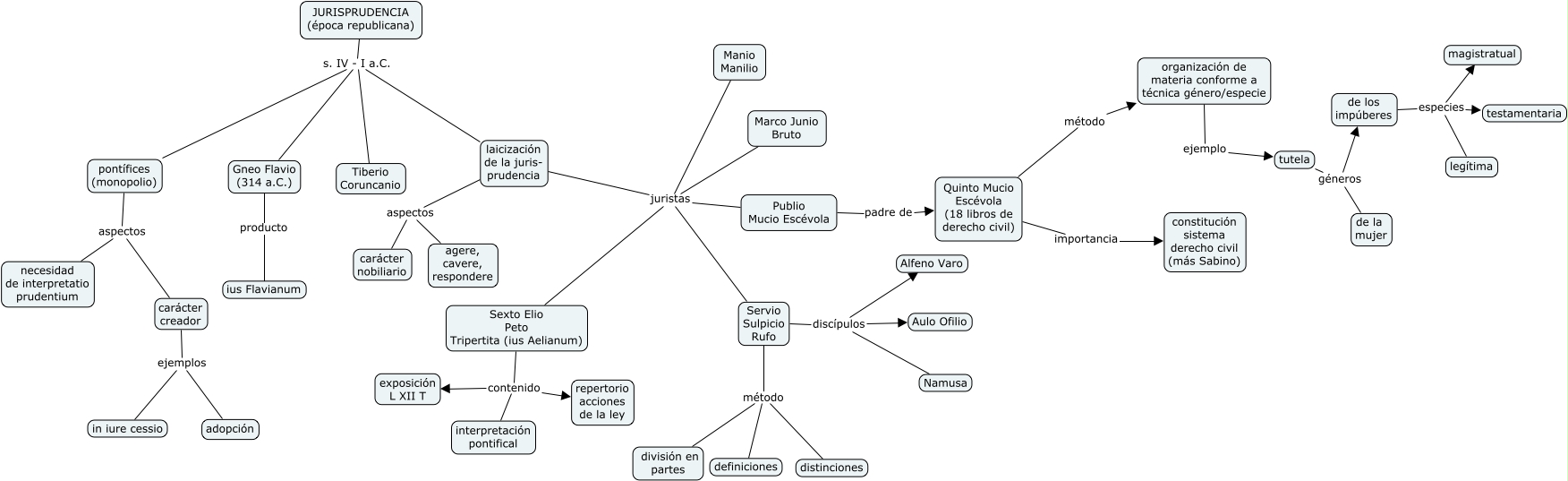 Este Cmap, tiene información relacionada con: Jurisprudencia, tutela géneros de la mujer, organización de materia conforme a técnica género/especie ejemplo tutela, JURISPRUDENCIA (época republicana) s. IV - I a.C. Gneo Flavio (314 a.C.), carácter creador ejemplos adopción, de los impúberes especies legítima, JURISPRUDENCIA (época republicana) s. IV - I a.C. Tiberio Coruncanio, Sexto Elio Peto Tripertita (ius Aelianum) contenido exposición L XII T, laicización de la juris- prudencia aspectos carácter nobiliario, Servio Sulpicio Rufo discípulos Alfeno Varo, laicización de la juris- prudencia aspectos agere, cavere, respondere, carácter creador ejemplos in iure cessio, Manio Manilio juristas Sexto Elio Peto Tripertita (ius Aelianum), Servio Sulpicio Rufo juristas Sexto Elio Peto Tripertita (ius Aelianum), Servio Sulpicio Rufo discípulos Aulo Ofilio, Publio Mucio Escévola padre de Quinto Mucio Escévola (18 libros de derecho civil), Marco Junio Bruto juristas Sexto Elio Peto Tripertita (ius Aelianum), Servio Sulpicio Rufo discípulos Namusa, pontífices (monopolio) aspectos necesidad de interpretatio prudentium, Quinto Mucio Escévola (18 libros de derecho civil) método organización de materia conforme a técnica género/especie, Publio Mucio Escévola juristas Sexto Elio Peto Tripertita (ius Aelianum)