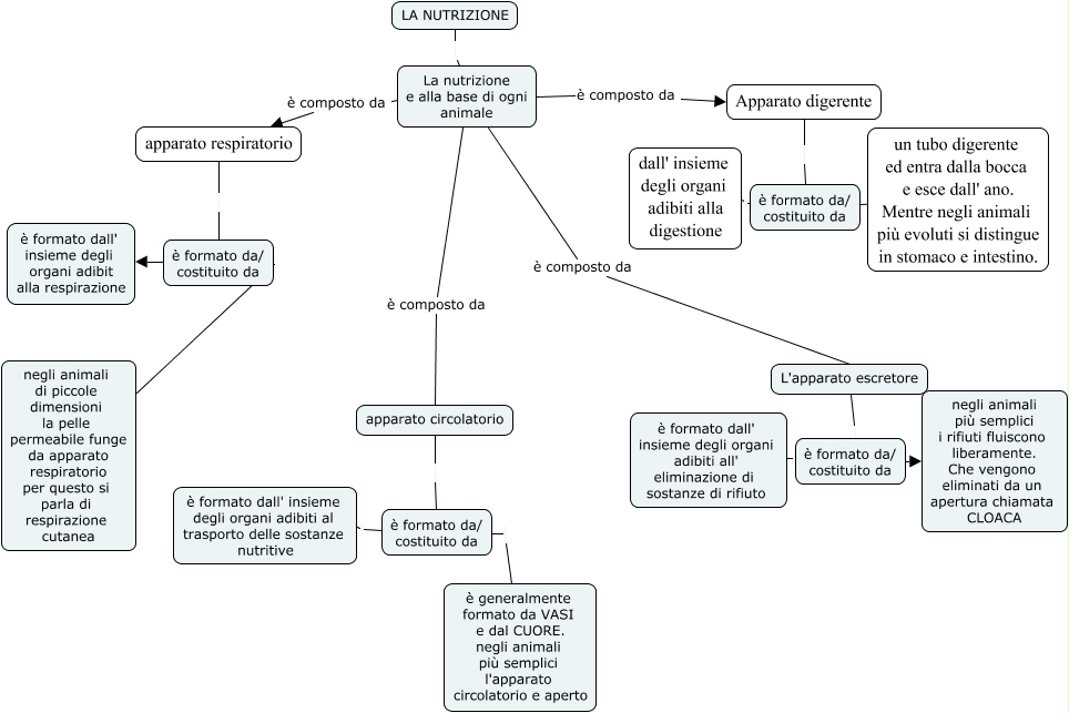 Questa Cmap, creata con IHMC CmapTools, contiene informazioni relative a: MAPPA MANUELE NUTRIZIONE, Apparato digerente è formato da/ costituito da, è formato da/ costituito da un tubo digerente ed entra dalla bocca e esce dall' ano. Mentre negli animali più evoluti si distingue in stomaco e intestino., apparato respiratorio è formato da/ costituito da, L'apparato escretore è formato da/ costituito da, è formato da/ costituito da negli animali più semplici i rifiuti fluiscono liberamente. Che vengono eliminati da un apertura chiamata CLOACA, La nutrizione e alla base di ogni animale è composto da apparato circolatorio, è formato da/ costituito da è formato dall' insieme degli organi adibiti all' eliminazione di sostanze di rifiuto, è formato da/ costituito da è generalmente formato da VASI e dal CUORE. negli animali più semplici l'apparato circolatorio e aperto, La nutrizione e alla base di ogni animale è composto da apparato respiratorio, apparato circolatorio è formato da/ costituito da, La nutrizione e alla base di ogni animale è composto da L'apparato escretore, è formato da/ costituito da è formato dall' insieme degli organi adibiti al trasporto delle sostanze nutritive, è formato da/ costituito da dall' insieme degli organi adibiti alla digestione, è formato da/ costituito da è formato dall' insieme degli organi adibit alla respirazione, La nutrizione e alla base di ogni animale è composto da Apparato digerente, LA NUTRIZIONE La nutrizione e alla base di ogni animale, è formato da/ costituito da negli animali di piccole dimensioni la pelle permeabile funge da apparato respiratorio per questo si parla di respirazione cutanea