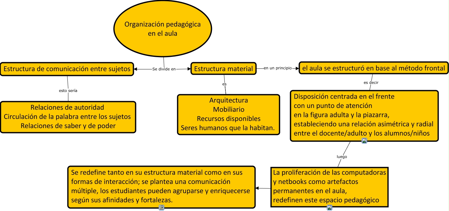 Este Cmap, tiene información relacionada con: NTE, Estructura material es Arquitectura Mobiliario Recursos disponibles Seres humanos que la habitan., Estructura material en un principio el aula se estructuró en base al método frontal, Estructura material es Arquitectura Mobiliario Recursos disponibles Seres humanos que la habitan., el aula se estructuró en base al método frontal es decir Disposición centrada en el frente con un punto de atención en la figura adulta y la piazarra, estableciendo una relación asimétrica y radial entre el docente/adulto y los alumnos/niños, Estructura de comunicación entre sujetos esto sería Relaciones de autoridad Circulación de la palabra entre los sujetos Relaciones de saber y de poder, Organización pedagógica en el aula Se divide en Estructura de comunicación entre sujetos, Estructura de comunicación entre sujetos esto sería Relaciones de autoridad Circulación de la palabra entre los sujetos Relaciones de saber y de poder, Disposición centrada en el frente con un punto de atención en la figura adulta y la piazarra, estableciendo una relación asimétrica y radial entre el docente/adulto y los alumnos/niños luego La proliferación de las computadoras y netbooks como artefactos permanentes en el aula, redefinen este espacio pedagógico, La proliferación de las computadoras y netbooks como artefactos permanentes en el aula, redefinen este espacio pedagógico ... Se redefine tanto en su estructura material como en sus formas de interacción; se plantea una comunicación múltiple, los estudiantes pueden agruparse y enriquecerse según sus afinidades y fortalezas., Organización pedagógica en el aula Se divide en Estructura material
