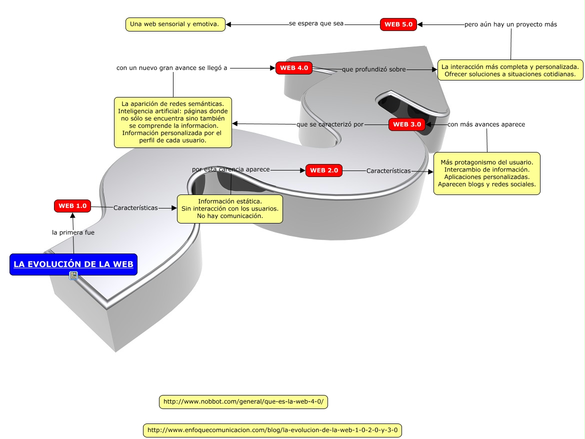 Este Cmap, tiene información relacionada con: la evolución de la web, Información estática. Sin interacción con los usuarios. No hay comunicación. por esta carencia aparece WEB 2.0, La aparición de redes semánticas. Inteligencia artificial: páginas donde no sólo se encuentra sino también se comprende la informacion. Información personalizada por el perfil de cada usuario. con un nuevo gran avance se llegó a WEB 4.0, Más protagonismo del usuario. Intercambio de información. Aplicaciones personalizadas. Aparecen blogs y redes sociales. con más avances aparece WEB 3.0, WEB 2.0 Características Más protagonismo del usuario. Intercambio de información. Aplicaciones personalizadas. Aparecen blogs y redes sociales., La interacción más completa y personalizada. Ofrecer soluciones a situaciones cotidianas. pero aún hay un proyecto más WEB 5.0, WEB 4.0 que profundizó sobre La interacción más completa y personalizada. Ofrecer soluciones a situaciones cotidianas., LA EVOLUCIÓN DE LA WEB la primera fue WEB 1.0, WEB 3.0 que se caracterizó por La aparición de redes semánticas. Inteligencia artificial: páginas donde no sólo se encuentra sino también se comprende la informacion. Información personalizada por el perfil de cada usuario., WEB 1.0 Características Información estática. Sin interacción con los usuarios. No hay comunicación., WEB 5.0 se espera que sea Una web sensorial y emotiva.