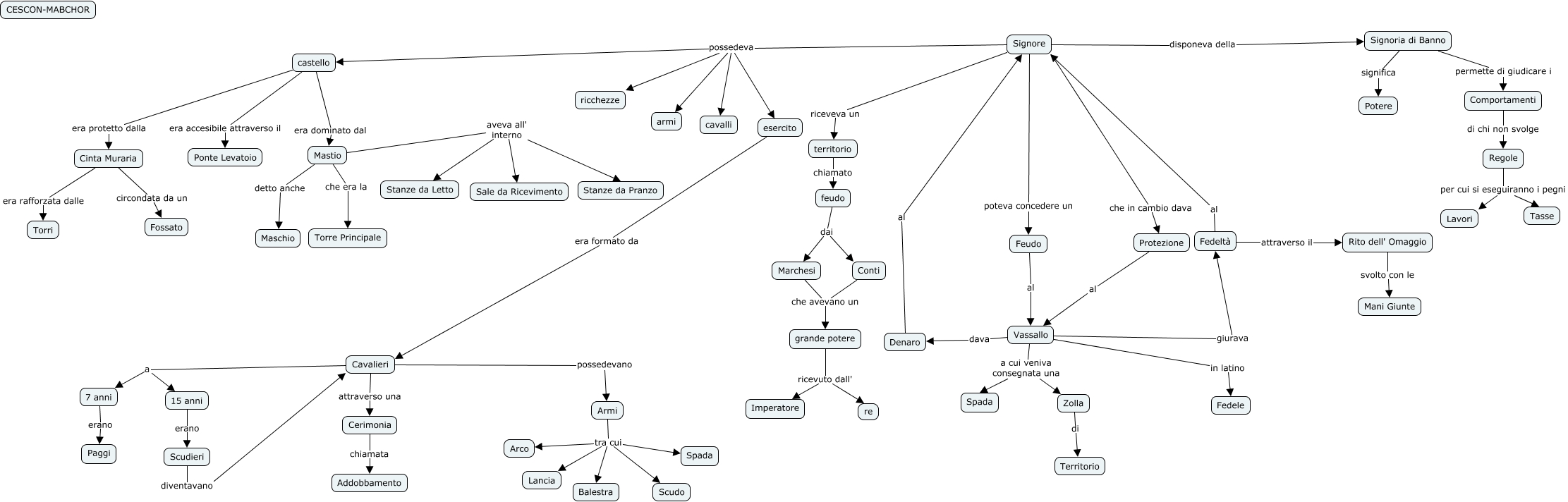 Questa Cmap, creata con IHMC CmapTools, contiene informazioni relative a: SINTESI i Signori Cescon - Mabchor recuperare 6 Cescon, Signoria di Banno significa Potere, Cavalieri possedevano Armi, Cerimonia chiamata Addobbamento, Signoria di Banno permette di giudicare i Comportamenti, Regole per cui si eseguiranno i pegni Tasse, Vassallo in latino Fedele, Feudo al Vassallo, Armi tra cui Scudo, Rito dell' Omaggio svolto con le Mani Giunte, Cavalieri a 15 anni, Vassallo a cui veniva consegnata una Zolla, Signore possedeva castello, Cinta Muraria era rafforzata dalle Torri, Signore possedeva armi, Mastio detto anche Maschio, Marchesi che avevano un grande potere, Signore riceveva un territorio, esercito era formato da Cavalieri, Denaro al Signore, Armi tra cui Arco