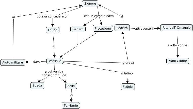 Questa Cmap, creata con IHMC CmapTools, contiene informazioni relative a: p. 138 A L'investitura dei vassali Cescon-Mabchor, Aiuto militare al Signore, Signore che in cambio dava Denaro, Signore che in cambio dava Protezione, Vassallo dava Aiuto militare, Protezione al Vassallo, Rito dell' Omaggio svolto con le Mani Giunte, Vassallo a cui veniva consegnata una Spada, Vassallo in latino Fedele, Denaro al Vassallo, Fedeltà al Signore, Signore poteva concedere un Feudo, Vassallo giurava Fedeltà, Feudo al Vassallo, Vassallo a cui veniva consegnata una Zolla, Fedeltà attraverso il Rito dell' Omaggio, Zolla di Territorio