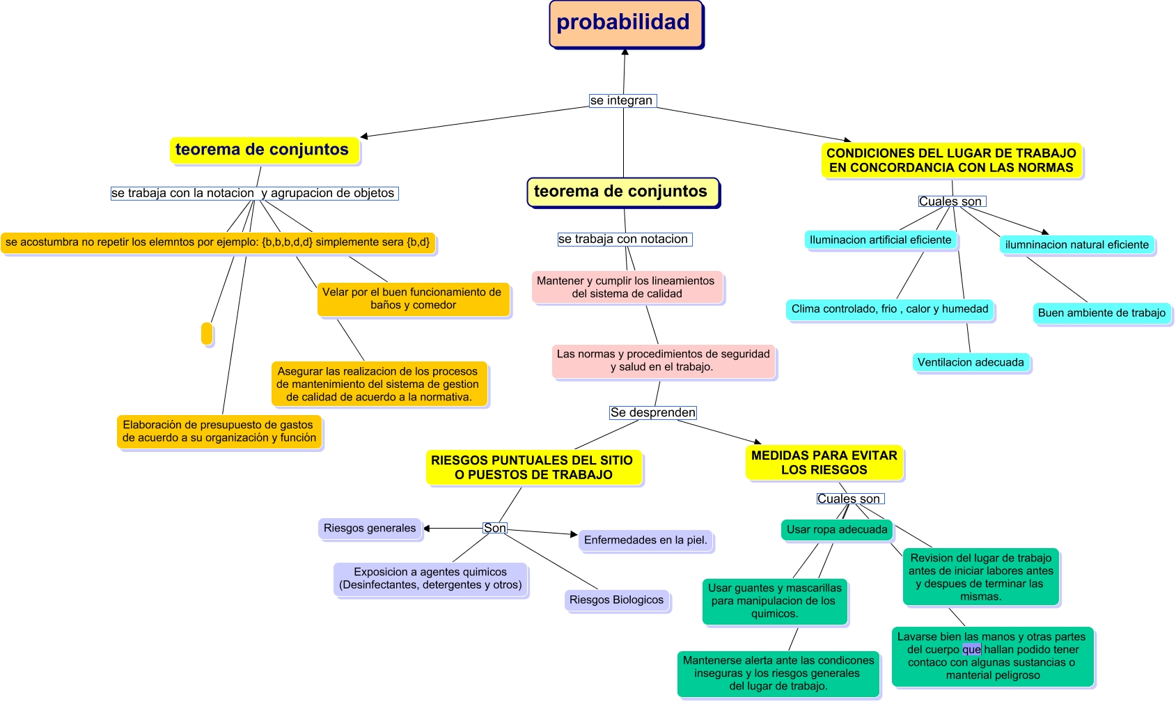 Aquest mapa conceptual conté informació relacionada amb: provabilidad, CONDICIONES DEL LUGAR DE TRABAJO EN CONCORDANCIA CON LAS NORMAS Cuales son Clima controlado, frio , calor y humedad, RIESGOS PUNTUALES DEL SITIO O PUESTOS DE TRABAJO Son Riesgos Biologicos, CONDICIONES DEL LUGAR DE TRABAJO EN CONCORDANCIA CON LAS NORMAS Cuales son Ventilacion adecuada, teorema de conjuntos se trabaja con la notacion y agrupacion de objetos Velar por el buen funcionamiento de baños y comedor, MEDIDAS PARA EVITAR LOS RIESGOS Cuales son Mantenerse alerta ante las condicones inseguras y los riesgos generales del lugar de trabajo., teorema de conjuntos se integran teorema de conjuntos, teorema de conjuntos se trabaja con la notacion y agrupacion de objetos Elaboración de presupuesto de gastos de acuerdo a su organización y función, RIESGOS PUNTUALES DEL SITIO O PUESTOS DE TRABAJO Son Exposicion a agentes quimicos (Desinfectantes, detergentes y otros), teorema de conjuntos se integran CONDICIONES DEL LUGAR DE TRABAJO EN CONCORDANCIA CON LAS NORMAS, CONDICIONES DEL LUGAR DE TRABAJO EN CONCORDANCIA CON LAS NORMAS Cuales son ilumninacion natural eficiente, teorema de conjuntos se integran probabilidad, teorema de conjuntos se trabaja con notacion Las normas y procedimientos de seguridad y salud en el trabajo., MEDIDAS PARA EVITAR LOS RIESGOS Cuales son Lavarse bien las manos y otras partes del cuerpo que hallan podido tener contaco con algunas sustancias o manterial peligroso, CONDICIONES DEL LUGAR DE TRABAJO EN CONCORDANCIA CON LAS NORMAS Cuales son Buen ambiente de trabajo, RIESGOS PUNTUALES DEL SITIO O PUESTOS DE TRABAJO Son Riesgos generales, MEDIDAS PARA EVITAR LOS RIESGOS Cuales son Usar ropa adecuada, teorema de conjuntos se trabaja con la notacion y agrupacion de objetos, teorema de conjuntos se trabaja con notacion Mantener y cumplir los lineamientos del sistema de calidad, MEDIDAS PARA EVITAR LOS RIESGOS Cuales son Revision del lugar de trabajo antes de iniciar labores antes y despues de terminar las mismas., teorema de conjuntos se trabaja con la notacion y agrupacion de objetos Asegurar las realizacion de los procesos de mantenimiento del sistema de gestion de calidad de acuerdo a la normativa.