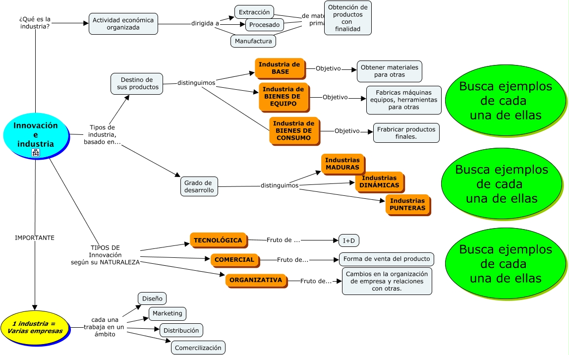 Este Cmap, tiene información relacionada con: industria, 1 industria = Varias empresas cada una trabaja en un ámbito Comercilización, Industria de BIENES DE EQUIPO Objetivo Fabricas máquinas equipos, herramientas para otras, Destino de sus productos distinguimos Industria de BASE, Innovación e industria TIPOS DE Innovación según su NATURALEZA ORGANIZATIVA, TECNOLÓGICA Fruto de ... I+D, Grado de desarrollo distinguimos Industrias MADURAS, Industria de BASE Objetivo Obtener materiales para otras, Extracción de materias primas Obtención de productos con finalidad, COMERCIAL Fruto de... Forma de venta del producto, Innovación e industria TIPOS DE Innovación según su NATURALEZA TECNOLÓGICA, 1 industria = Varias empresas cada una trabaja en un ámbito Marketing, Destino de sus productos distinguimos Industria de BIENES DE CONSUMO, Actividad económica organizada dirigida a Procesado, Actividad económica organizada dirigida a Extracción, Industria de BIENES DE CONSUMO Objetivo Frabricar productos finales., 1 industria = Varias empresas cada una trabaja en un ámbito Diseño, Innovación e industria Tipos de industria, basado en... Destino de sus productos, Grado de desarrollo distinguimos Industrias DINÁMICAS, Grado de desarrollo distinguimos Industrias PUNTERAS, 1 industria = Varias empresas cada una trabaja en un ámbito Distribución