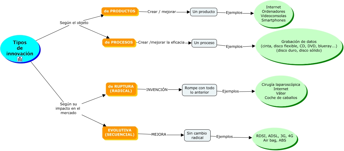 Este Cmap, tiene información relacionada con: tipos innovación, Rompe con todo lo anterior Ejemplos Cirugía laparoscópica Internet Váter Coche de caballos, de RUPTURA (RADICAL) INVENCIÓN Rompe con todo lo anterior, de PRODUCTOS Crear / mejorar Un producto, Tipos de innovación Según el objeto de PRODUCTOS, Sin cambio radical Ejemplos RDSI, ADSL, 3G, 4G Air bag, ABS, Tipos de innovación Según su impacto en el mercado de RUPTURA (RADICAL), Un proceso Ejemplos Grabación de datos (cinta, disco flexible, CD, DVD, blueray...) (disco duro, disco sólido), Tipos de innovación Según el objeto de PROCESOS, de PROCESOS Crear /mejorar la eficacia Un proceso, Un producto Ejemplos Internet Ordenadores Videoconsolas Smartphones, EVOLUTIVA (SECUENCIAL) MEJORA Sin cambio radical, Tipos de innovación Según su impacto en el mercado EVOLUTIVA (SECUENCIAL)