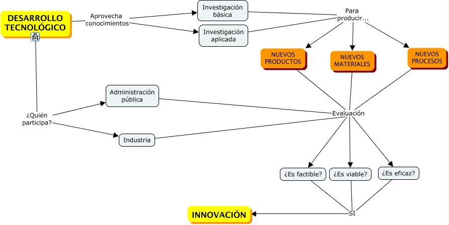 Este Cmap, tiene información relacionada con: desarrollo, DESARROLLO TECNOLÓGICO ¿Quién participa? Administración pública, NUEVOS PRODUCTOS Evaluación ¿Es factible?, ¿Es viable? SI INNOVACIÓN, DESARROLLO TECNOLÓGICO ¿Quién participa? Industria, Administración pública Evaluación ¿Es eficaz?, Investigación aplicada Para producir... NUEVOS PROCESOS, NUEVOS PRODUCTOS Evaluación ¿Es viable?, Investigación básica Para producir... NUEVOS PRODUCTOS, Industria Evaluación ¿Es viable?, NUEVOS MATERIALES Evaluación ¿Es eficaz?, NUEVOS PRODUCTOS Evaluación ¿Es eficaz?, DESARROLLO TECNOLÓGICO Aprovecha conocimientos Investigación básica, Investigación básica Para producir... NUEVOS MATERIALES, ¿Es factible? SI INNOVACIÓN, ¿Es eficaz? SI INNOVACIÓN, NUEVOS PROCESOS Evaluación ¿Es factible?, NUEVOS PROCESOS Evaluación ¿Es eficaz?, Industria Evaluación ¿Es factible?, Investigación aplicada Para producir... NUEVOS PRODUCTOS, Industria Evaluación ¿Es eficaz?