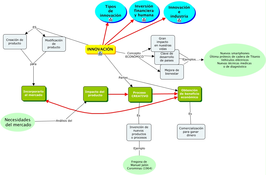 Este Cmap, tiene información relacionada con: innovación, INNOVACIÓN ???? Inversión financiera y humana, INNOVACIÓN Concepto ECONÓMICO Gran impacto en nuestras vidas, INNOVACIÓN Concepto ECONÓMICO Clave de desarrollo de paises, Gran impacto en nuestras vidas Ejemplos... Nuevos smartphones Última prótesis de cadera de Titanio Vehículos eléctricos Nuevas técnicas medicas o de diagnóstico, Clave de desarrollo de paises Ejemplos... Nuevos smartphones Última prótesis de cadera de Titanio Vehículos eléctricos Nuevas técnicas medicas o de diagnóstico, Obtención de beneficio económico Es Comercialización para ganar dinero, Impacto del producto ???? Proceso CREATIVO, Invención de nuevos productos o procesos Ejemplo Fregona de Manuel Jalón Corominas (1964), Necesidades del mercado Análisis del Impacto del producto, INNOVACIÓN Partes Proceso CREATIVO, Proceso CREATIVO ???? Obtención de beneficio económico, Creación de producto para Incorporarlo al mercado, Mejora de bienestar Ejemplos... Nuevos smartphones Última prótesis de cadera de Titanio Vehículos eléctricos Nuevas técnicas medicas o de diagnóstico, INNOVACIÓN ???? Tipos de innovación, INNOVACIÓN Concepto ECONÓMICO Mejora de bienestar, Proceso CREATIVO Es Invención de nuevos productos o procesos, INNOVACIÓN ES Creación de producto, Incorporarlo al mercado ???? Obtención de beneficio económico, INNOVACIÓN Partes Obtención de beneficio económico, Modificación de producto para Incorporarlo al mercado