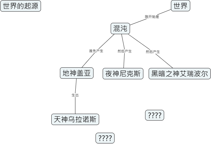 此概念图以 IHMC CmapTools 创建, 内含信息有关于: 世界的起源, 混沌 首先产生 地神盖亚, 地神盖亚 生出 天神乌拉诺斯, 世界 刚开始是 混沌, 混沌 然后产生 黑暗之神艾瑞波尔, 混沌 然后产生 夜神尼克斯