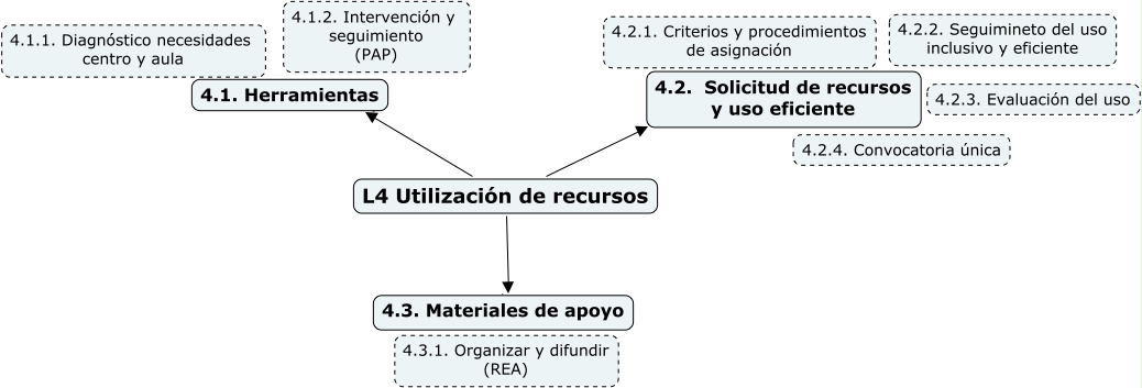 Este Cmap, tiene información relacionada con: L4, L4 Utilización de recursos ???? 4.3. Materiales de apoyo, L4 Utilización de recursos ???? 4.1. Herramientas, L4 Utilización de recursos ???? 4.2. Solicitud de recursos y uso eficiente