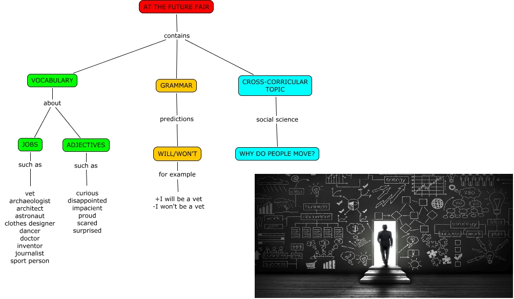 Este Cmap, tiene información relacionada con: AT THE FUTURE FAIR-Martina y Germán, WILL/WON'T for example +I will be a vet -I won't be a vet, AT THE FUTURE FAIR contains VOCABULARY, AT THE FUTURE FAIR contains GRAMMAR, GRAMMAR predictions WILL/WON'T, JOBS such as vet archaeologist architect astronaut clothes designer dancer doctor inventor journalist sport person, VOCABULARY about ADJECTIVES, AT THE FUTURE FAIR contains CROSS-CORRICULAR TOPIC, ADJECTIVES such as curious disappointed impacient proud scared surprised, VOCABULARY about JOBS, CROSS-CORRICULAR TOPIC social science WHY DO PEOPLE MOVE?