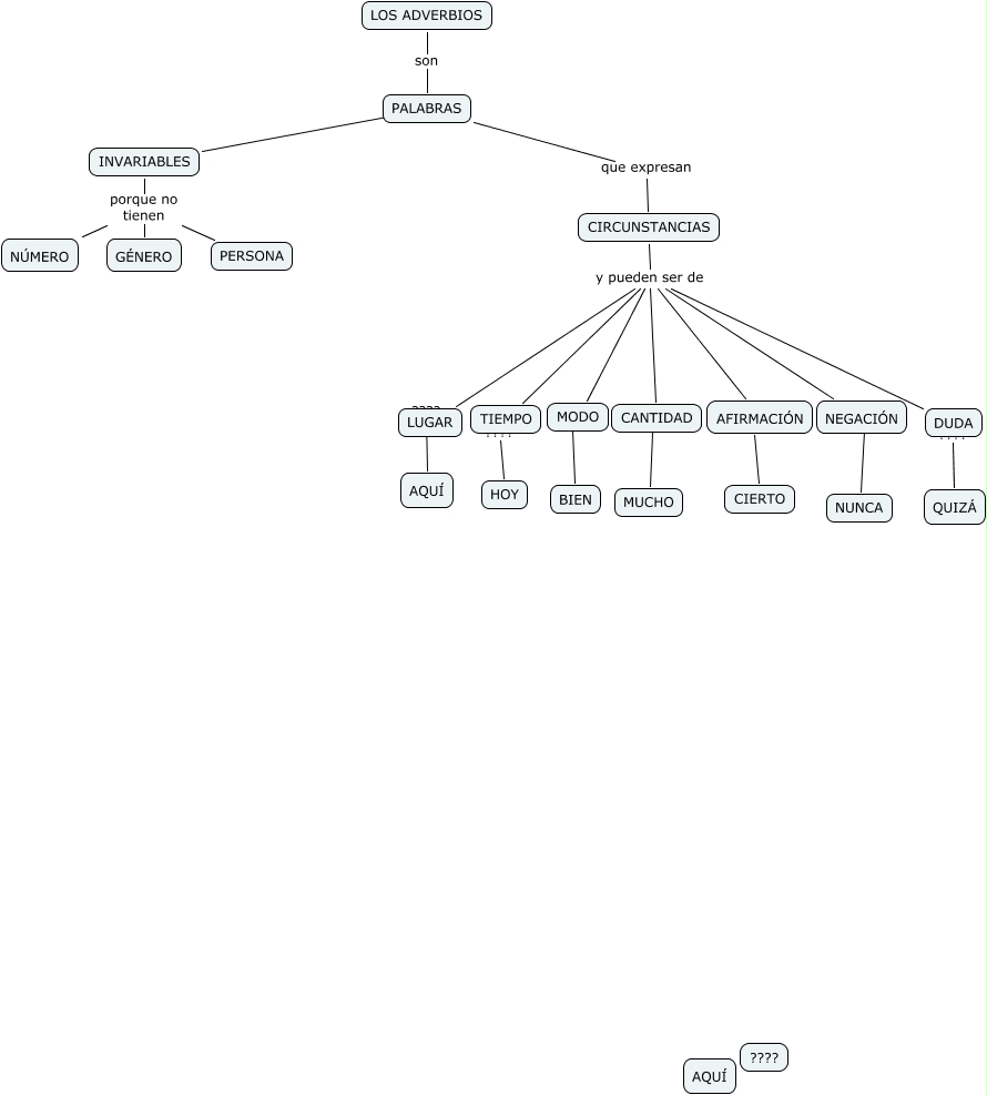 Este Cmap, tiene información relacionada con: LOS ADVERBIOS(CRISTINA), CIRCUNSTANCIAS y pueden ser de LUGAR, LOS ADVERBIOS son PALABRAS, INVARIABLES porque no tienen NÚMERO, CIRCUNSTANCIAS y pueden ser de DUDA, INVARIABLES porque no tienen GÉNERO, INVARIABLES porque no tienen PERSONA, PALABRAS ???? INVARIABLES, CANTIDAD ???? MUCHO, AFIRMACIÓN ???? CIERTO, NEGACIÓN ???? NUNCA, PALABRAS que expresan CIRCUNSTANCIAS, CIRCUNSTANCIAS y pueden ser de MODO, CIRCUNSTANCIAS y pueden ser de CANTIDAD, DUDA ???? QUIZÁ, CIRCUNSTANCIAS y pueden ser de TIEMPO, CIRCUNSTANCIAS y pueden ser de NEGACIÓN, LUGAR ???? AQUÍ, CIRCUNSTANCIAS y pueden ser de AFIRMACIÓN, TIEMPO ???? HOY, MODO ???? BIEN