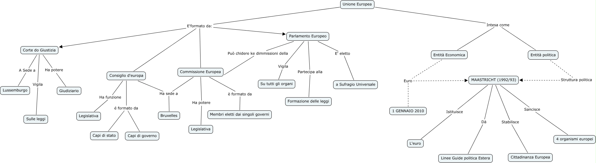 Questa Cmap, creata con IHMC CmapTools, contiene informazioni relative a: UE-giulio, Unione Europea Intesa come Entità politica, Unione Europea E'formato da: Consiglio d'europa, Parlamento Europeo Vigila Su tutti gli organi, MAASTRICHT (1992/93) Istituisce L'euro, Consiglio d'europa Ha sede a Bruxelles, Parlamento Europeo Può chidere ke dimmissioni della Commissione Europea, MAASTRICHT (1992/93) Stabilisce Cittadinanza Europea, Commissione Europea Ha potere Legislativa, Commissione Europea Ha sede a Bruxelles, Parlamento Europeo Partecipa alla Formazione delle leggi, Unione Europea E'formato da: Parlamento Europeo, Consiglio d'europa é formato da Capi di governo, Consiglio d'europa é formato da Capi di stato, Corte do Giustizia Vigila Sulle leggi, Consiglio d'europa Ha funzione Legislativa, Commissione Europea è formato da Membri eletti dai singoli governi, Entità Economica Euro MAASTRICHT (1992/93), Corte do Giustizia Ha potere Giudiziario, MAASTRICHT (1992/93) Dà Linee Guide politica Estera, Parlamento Europeo E' eletto a Sufragio Universale
