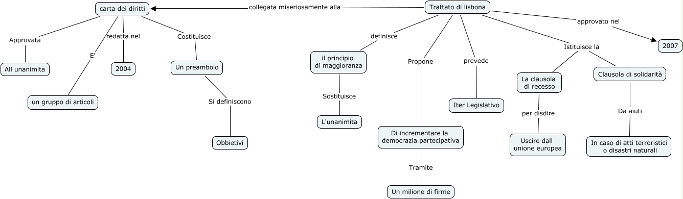 Questa Cmap, creata con IHMC CmapTools, contiene informazioni relative a: trattato di lisbona giulio c, Un preambolo Si definiscono Obbietivi, il principio di maggioranza Sostituisce L'unanimita, carta dei diritti E' un gruppo di articoli, Trattato di lisbona prevede Iter Legislativo, La clausola di recesso per disdire Uscire dall unione europea, Clausola di solidarità Da aiuti In caso di atti terroristici o disastri naturali, Trattato di lisbona Propone Di incrementare la democrazia partecipativa, Trattato di lisbona Istituisce la Clausola di solidarità, Di incrementare la democrazia partecipativa Tramite Un milione di firme, carta dei diritti Costituisce Un preambolo, Trattato di lisbona definisce il principio di maggioranza, carta dei diritti redatta nel 2004, carta dei diritti Approvata All unanimita, Trattato di lisbona collegata miseriosamente alla carta dei diritti, Trattato di lisbona Istituisce la La clausola di recesso, Trattato di lisbona approvato nel 2007