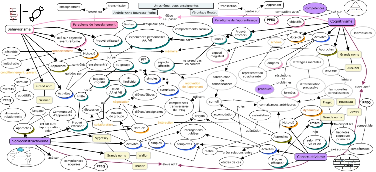 This Concept Map, created with IHMC CmapTools, has information related to: Final, Prouvé efficace? oui par expériences personnelles AA, VB, travaux de groupe négociation élèves/enseignants, Approches stimuli, limites favorisent les habiletés cognitives primaires, Approches créer relations entre réalité, Béhaviorisme Mots-clé, les nouvelles connaissances aux connaisances antérieures, Cognitivisme axé sur objectifs, Socioconstructivisme Grands noms, Constructivisme Prouvé efficace?, Cognitivisme Grands noms, Béhaviorisme Prouvé efficace?, Approches ancrage, dirigées Activités, Prouvé efficace? limites, Activités intérogations guidées, Socioconstructivisme Prouvé efficace?, compétences acquises PFEQ, Activités exposé magistral, Paradigme de l'enseignement centré sur enseignement