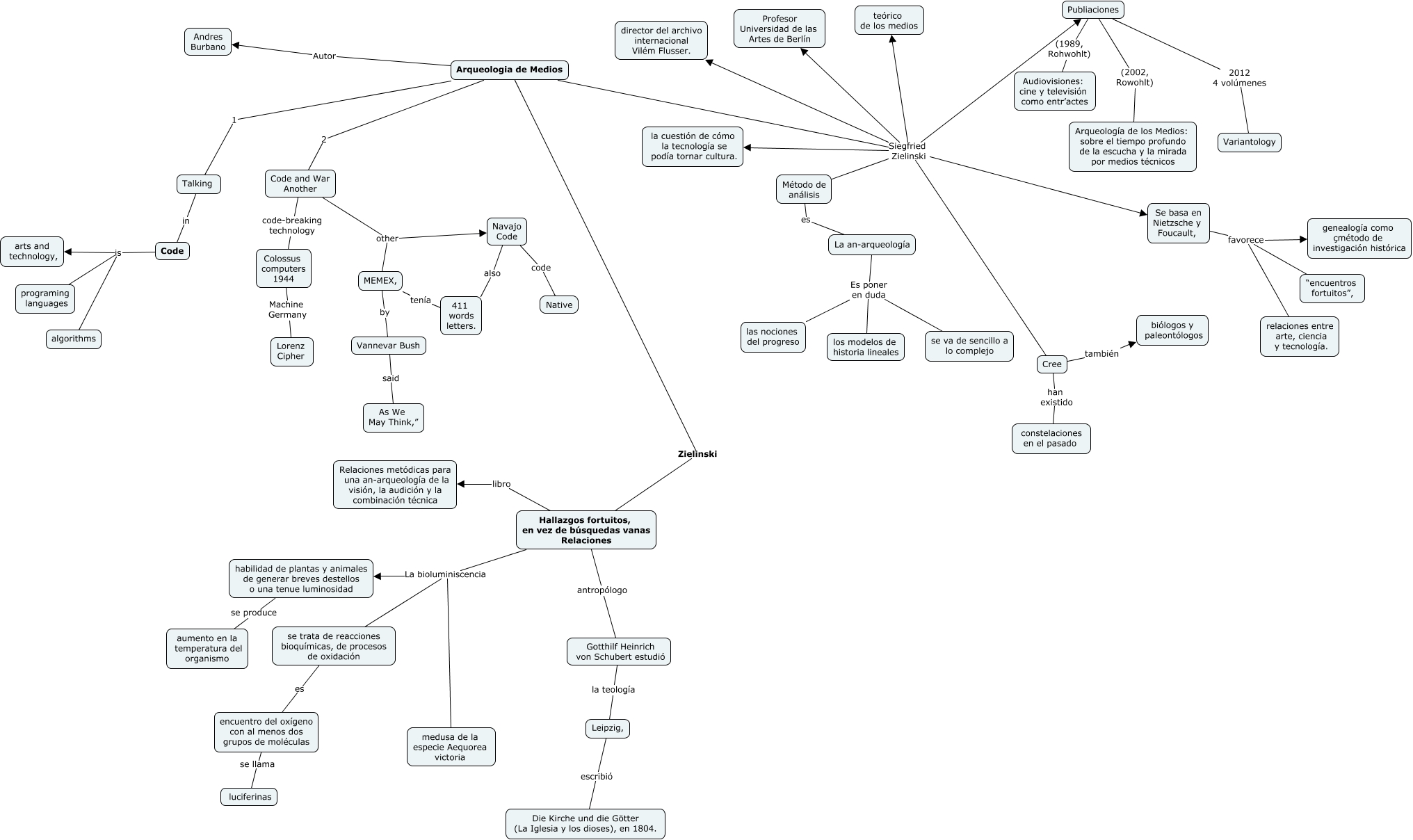 Este Cmap, tiene información relacionada con: Arqueología de medios_Burbano_Zielinski, Se basa en Nietzsche y Foucault, favorece “encuentros fortuitos”,, Método de análisis es La an-arqueología, Code and War Another code-breaking technology Colossus computers 1944, Arqueologia de Medios Zielinski Hallazgos fortuitos, en vez de búsquedas vanas Relaciones, Leipzig, escribió Die Kirche und die Götter (La Iglesia y los dioses), en 1804., Arqueologia de Medios 1 Talking, Publiaciones (1989, Rohwohlt) Audiovisiones: cine y televisión como entr’actes, Code is programing languages, Arqueologia de Medios Siegfried Zielinski director del archivo internacional Vilém Flusser., encuentro del oxígeno con al menos dos grupos de moléculas se llama luciferinas, Hallazgos fortuitos, en vez de búsquedas vanas Relaciones La bioluminiscencia medusa de la especie Aequorea victoria, Arqueologia de Medios Siegfried Zielinski teórico de los medios, Code is algorithms, Arqueologia de Medios Autor Andres Burbano, Arqueologia de Medios Siegfried Zielinski Se basa en Nietzsche y Foucault,, La an-arqueología Es poner en duda las nociones del progreso, Talking in Code, Code is arts and technology,, Arqueologia de Medios Siegfried Zielinski Publiaciones, Se basa en Nietzsche y Foucault, favorece genealogía como çmétodo de investigación histórica