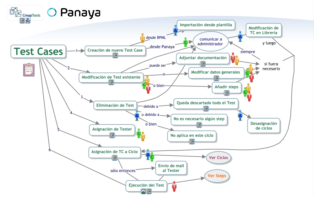 Este Cmap, tiene información relacionada con: Panaya Training CM1 TC, Añadir steps ???? si fuera necesario, Test Cases 5 Asignación de TC a Ciclo, Eliminación de Test o debido a No es necesario algún step, Eliminación de Test ???? comunicar a administrador, Asignación de TC a Ciclo sólo entonces Ejecución del Test, Test Cases 2 Modificación de Test existente, si fuera necesario ???? Adjuntar documentación, Creación de nuevo Test Case desde BPML Importación desde plantilla, Eliminación de Test debido a Queda descartado todo el Test, Eliminación de Test o bien No aplica en este ciclo, Asignación de TC a Ciclo sólo entonces Envío de mail al Tester, Modificación de Test existente ???? comunicar a administrador, Ejecución del Test ???? Ver Steps, Modificación de Test existente puede ser Adjuntar documentación, Envío de mail al Tester ???? Ejecución del Test, Modificación de Test existente o bien Añadir steps, Creación de nuevo Test Case desde Panaya comunicar a administrador, comunicar a administrador ???? Modificación de TC en Librería, Test Cases 1 Creación de nuevo Test Case, Modificación de Test existente o Modificar datos generales