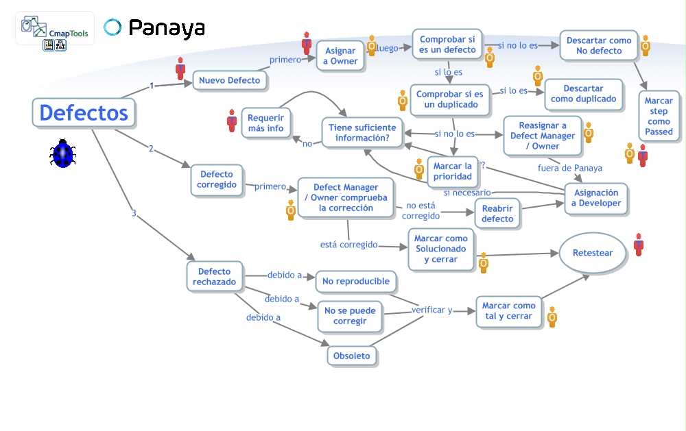 Este Cmap, tiene información relacionada con: Panaya Training CM4 Defects, Asignación a Developer si necesario Tiene suficiente información?, Comprobar si es un duplicado si lo es Descartar como duplicado, Asignación a Developer ???? Tiene suficiente información?, Marcar como tal y cerrar Retestear, Defecto corregido primero Defect Manager / Owner comprueba la corrección, No reproducible verificar y Marcar como tal y cerrar, Defect Manager / Owner comprueba la corrección está corregido Marcar como Solucionado y cerrar, Descartar como No defecto ???? Marcar step como Passed, Comprobar si es un duplicado si no lo es Marcar la prioridad, Comprobar si es un duplicado si no lo es Reasignar a Defect Manager / Owner, Defecto rechazado debido a No reproducible, Marcar como Solucionado y cerrar ???? Retestear, Defectos 1 Nuevo Defecto, Defectos 2 Defecto corregido, Reabrir defecto ???? Asignación a Developer, Reasignar a Defect Manager / Owner fuera de Panaya Asignación a Developer, Tiene suficiente información? no Requerir más info, Comprobar si es un duplicado si no lo es Tiene suficiente información?, Obsoleto verificar y Marcar como tal y cerrar, Defectos 1 Nuevo Defecto