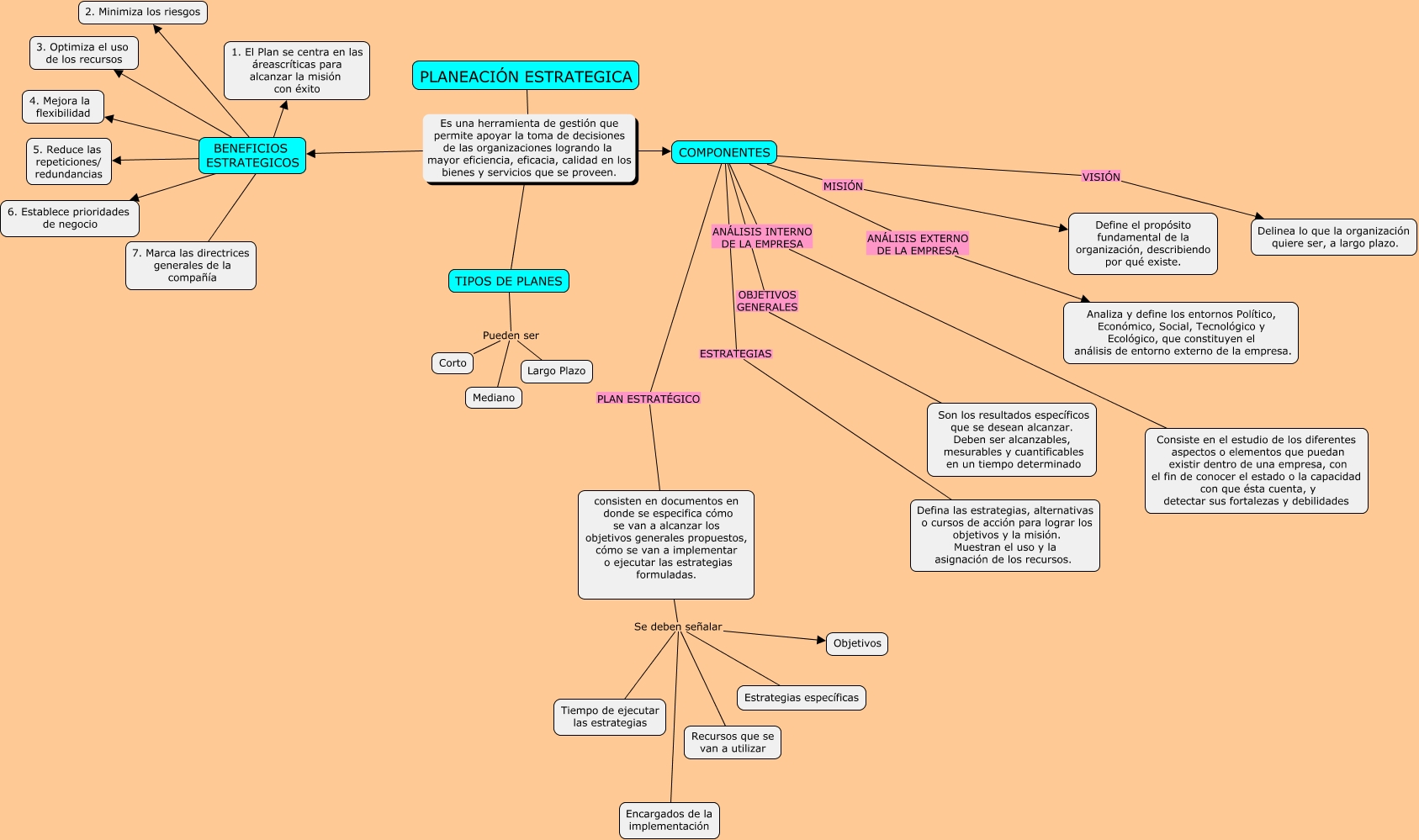 Este Cmap, tiene información relacionada con: PLANEACION ESTRATEGICA, PLANEACIÓN ESTRATEGICA Es una herramienta de gestión que permite apoyar la toma de decisiones de las organizaciones logrando la mayor eficiencia, eficacia, calidad en los bienes y servicios que se proveen. BENEFICIOS ESTRATEGICOS, PLANEACIÓN ESTRATEGICA Es una herramienta de gestión que permite apoyar la toma de decisiones de las organizaciones logrando la mayor eficiencia, eficacia, calidad en los bienes y servicios que se proveen. TIPOS DE PLANES, BENEFICIOS ESTRATEGICOS ???? 3. Optimiza el uso de los recursos, TIPOS DE PLANES Pueden ser Mediano, COMPONENTES ANÁLISIS INTERNO DE LA EMPRESA Consiste en el estudio de los diferentes aspectos o elementos que puedan existir dentro de una empresa, con el fin de conocer el estado o la capacidad con que ésta cuenta, y detectar sus fortalezas y debilidades, BENEFICIOS ESTRATEGICOS ???? 2. Minimiza los riesgos, TIPOS DE PLANES Pueden ser Largo Plazo, BENEFICIOS ESTRATEGICOS ???? 7. Marca las directrices generales de la compañía, COMPONENTES VISIÓN Delinea lo que la organización quiere ser, a largo plazo., COMPONENTES ESTRATEGIAS Defina las estrategias, alternativas o cursos de acción para lograr los objetivos y la misión. Muestran el uso y la asignación de los recursos., consisten en documentos en donde se especifica cómo se van a alcanzar los objetivos generales propuestos, cómo se van a implementar o ejecutar las estrategias formuladas. Se deben señalar Recursos que se van a utilizar, COMPONENTES PLAN ESTRATÉGICO consisten en documentos en donde se especifica cómo se van a alcanzar los objetivos generales propuestos, cómo se van a implementar o ejecutar las estrategias formuladas., TIPOS DE PLANES Pueden ser Corto, PLANEACIÓN ESTRATEGICA Es una herramienta de gestión que permite apoyar la toma de decisiones de las organizaciones logrando la mayor eficiencia, eficacia, calidad en los bienes y servicios que se proveen. COMPONENTES, BENEFICIOS ESTRATEGICOS ???? 1. El Plan se centra en las áreascríticas para alcanzar la misión con éxito, BENEFICIOS ESTRATEGICOS ???? 4. Mejora la flexibilidad, consisten en documentos en donde se especifica cómo se van a alcanzar los objetivos generales propuestos, cómo se van a implementar o ejecutar las estrategias formuladas. Se deben señalar Estrategias específicas, COMPONENTES OBJETIVOS GENERALES Son los resultados específicos que se desean alcanzar. Deben ser alcanzables, mesurables y cuantificables en un tiempo determinado, COMPONENTES ANÁLISIS EXTERNO DE LA EMPRESA Analiza y define los entornos Político, Económico, Social, Tecnológico y Ecológico, que constituyen el análisis de entorno externo de la empresa., BENEFICIOS ESTRATEGICOS ???? 6. Establece prioridades de negocio