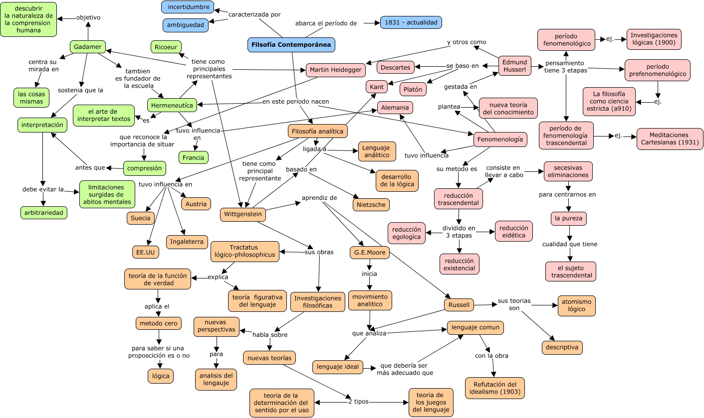 Este Cmap, tiene información relacionada con: Filosofía Mapa Conecp, Filsofía Contemporánea en este período nacen Hermeneutíca, Wittgenstein sus obras Tractatus lógico-philosophicus, Hermeneutíca tuvo influencia en Alemania, Hermeneutíca tiene como principales representantes Ricoeur, reducción trascendental dividido en 3 etapas reducción egologíca, período de fenomenología trascendental ej. Meditaciones Cartesianas (1931), Fenomenología gestada en Edmund Husserl, reducción trascendental consiste en llevar a cabo secesivas eliminaciones, Gadamer sostenia que la interpretación, Edmund Husserl pensamiento tiene 3 etapas período prefenomenológico, Wittgenstein basado en Nietzsche, lenguaje ideal que debería ser más adecuado que lenguaje comun, reducción trascendental dividido en 3 etapas reducción existencial, Fenomenología su metodo es reducción trascendental, Gadamer objetivo descubrir la naturaleza de la comprension humana, Filsofía Contemporánea caracterizada por ambiguedad, Martin Heidegger que reconoce la importancia de situar compresión, movimiento analitico que analiza lenguaje ideal, la pureza cualidad que tiene el sujeto trascendental, Investigaciones filosóficas habla sobre nuevas teorías