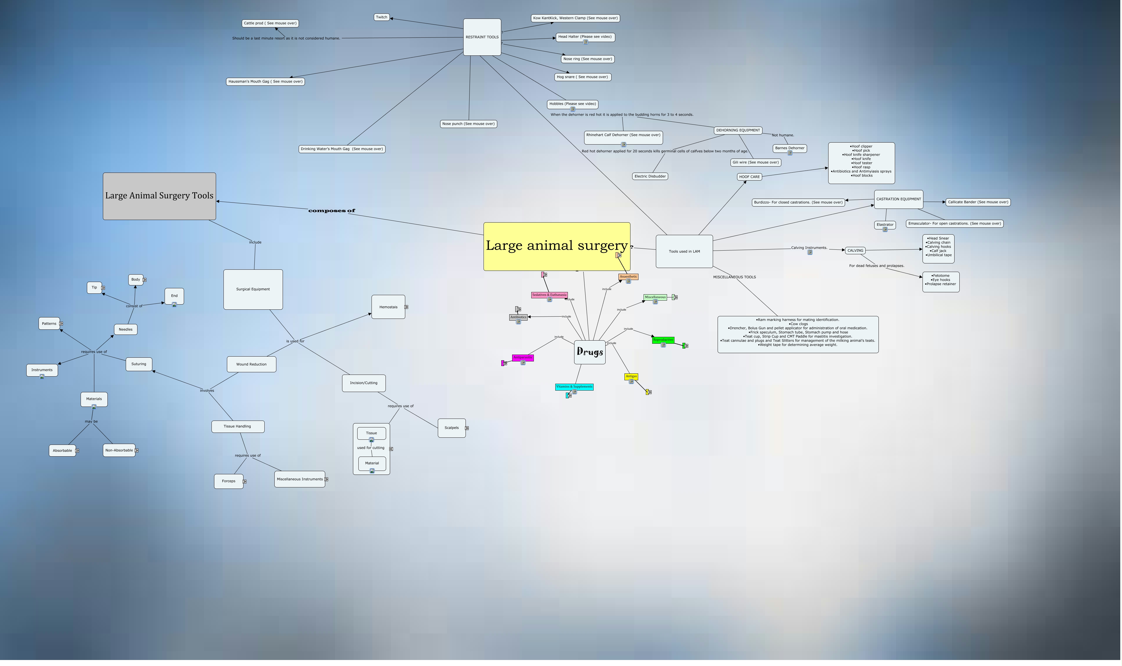 This Concept Map, created with IHMC CmapTools, has information related to: LAS LAB 1, Surgical Equipment is used for Hemostais, Reproductive Fertiline, Sedatives & Euthanasia Natrium pentobarbital, CASTRATION EQUIPMENT ???? Burdizzo- For closed castrations. (See mouse over), Suturing requires use of Needles, Antiparasitic composes Ectoparasitic, Miscellaneous Tetanus antitoxin, Reproductive Lutalyse, Suturing requires use of Materials, Antigas PCE-Glycol, Drugs include Anaesthetic, Antiparasitic composes Endoparasitic, Ectoparasitic Quinuronium sulphate, Reproductive Progesterin Rep, Miscellaneous Urolix diuretico, Suturing requires use of Patterns, Anaesthetic Silver sulfadiazine, Drugs include Vitamins & Supplements, RESTRAINT TOOLS ???? Nose punch (See mouse over), Reproductive Metricure