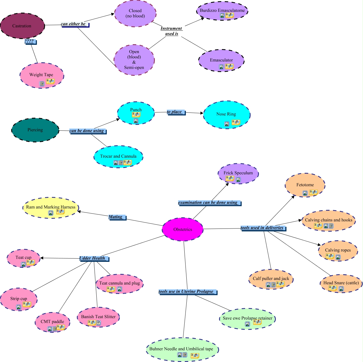 This Concept Map, created with IHMC CmapTools, has information related to: lab 1, Obstetrics tools used in deliveries Calving ropes, Obstetrics Udder Health Teat cannula and plug, Obstetrics tools used in deliveries Calf puller and jack, Open (blood) & Semi-open Instrument used is Emasculator, Obstetrics tools use in Uterine Prolapse Buhner Needle and Umbilical tape, Castration ???? Weight Tape, Obstetrics tools used in deliveries Calving chains and hooks, Obstetrics Udder Health Teat cup, Closed (no blood) Instrument used is Burdizzo Emasculatome, Piercing can be done using Trocar and Cannula, Piercing can be done using Punch, Closed (no blood) Instrument used is Emasculator, Obstetrics Udder Health CMT paddle, Obstetrics Mating Ram and Marking Harness, Obstetrics examination can be done using Frick Speculum, Castration can either be Open (blood) & Semi-open, Obstetrics tools use in Uterine Prolapse Save ewe Prolapse retainer, Punch to place Nose Ring, Castration can either be Closed (no blood), Obstetrics tools used in deliveries Fetotome