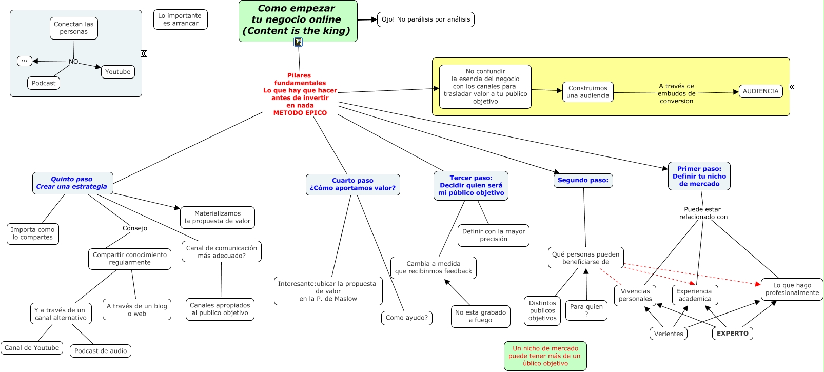 IHMC CmapTools-ekin sortu den kontzeptu-mapa honek honi buruzko informazioa du: Como empezar tu negio online, Y a través de un canal alternativo Podcast de audio, No esta grabado a fuego Cambia a medida que recibinmos feedback, Primer paso: Definir tu nicho de mercado Puede estar relacionado con Experiencia academica, Como empezar tu negocio online (Content is the king) Pilares fundamentales Lo que hay que hacer antes de invertir en nada METODO EPICO No confundir la esencia del negocio con los canales para trasladar valor a tu publico objetivo, Para quien ? Qué personas pueden beneficiarse de, Como empezar tu negocio online (Content is the king) ???? Ojo! No parálisis por análisis, EXPERTO Experiencia academica, Como empezar tu negocio online (Content is the king) Pilares fundamentales Lo que hay que hacer antes de invertir en nada METODO EPICO Primer paso: Definir tu nicho de mercado, Tercer paso: Decidir quien será mi público objetivo Cambia a medida que recibinmos feedback, Quinto paso Crear una estrategia Materializamos la propuesta de valor, Verientes Vivencias personales, Cuarto paso ¿Cómo aportamos valor? Interesante:ubicar la propuesta de valor en la P. de Maslow, Conectan las personas NO Youtube, Qué personas pueden beneficiarse de Experiencia academica, Como empezar tu negocio online (Content is the king) Pilares fundamentales Lo que hay que hacer antes de invertir en nada METODO EPICO Quinto paso Crear una estrategia, Verientes Lo que hago profesionalmente, Cuarto paso ¿Cómo aportamos valor? Como ayudo?, Quinto paso Crear una estrategia Consejo Compartir conocimiento regularmente, Y a través de un canal alternativo Canal de Youtube, Compartir conocimiento regularmente Y a través de un canal alternativo
