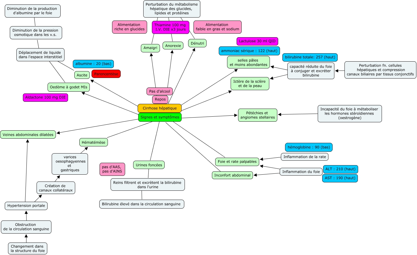 Cette carte de concepts créée avec IHMC CmapTools traite de: Cirrhose hépatique, Signes et symptômes ???? Foie et rate palpables, Reins filtrent et excrètent la bilirubine dans l'urine ???? Urines foncées, Diminution de la production d'albumine par le foie ???? Diminution de la pression osmotique dans les v.s., Diminution de la pression osmotique dans les v.s. ???? Déplacement de liquide dans l'espace interstitiel, capacité réduite du foie à conjuger et excréter bilirubine ???? Ictère de la sclère et de la peau, Création de canaux collatéraux ???? varices oesophagyennes et gastriques, Bilirubine élevé dans la circulation sanguine ???? Reins filtrent et excrètent la bilirubine dans l'urine, Perturbation du métabolisme hépatique des glucides, lipides et protéines ???? Amaigri, Changement dans la structure du foie ???? Obstruction de la circulation sanguine, Inflammation du foie ???? Inconfort abdominal, Incapacité du foie à métaboliser les hormones stéroïdiennes (oestrogène) ???? Pétéchies et angiomes stellaires, Signes et symptômes ???? Anorexie, Signes et symptômes ???? selles pâles et moins abondantes, Signes et symptômes ???? Pétéchies et angiomes stellaires, Hypertension portale ???? Veines abdominales dilatées, varices oesophagyennes et gastriques ???? Hématémèse, Déplacement de liquide dans l'espace interstitiel ???? Ascite, Signes et symptômes ???? Dénutri, Perturbation du métabolisme hépatique des glucides, lipides et protéines ???? Anorexie, Signes et symptômes ???? Oedème à godet MIs