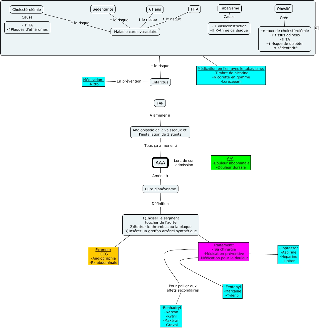 Cette carte de concepts créée avec IHMC CmapTools traite de: Cure des AAA, Sédentarité ↑ le risque Maladie cardiovasculaire, Médication en lien avec le tabagisme: -Timbre de nicotine -Nicorette en gomme -Lorazepam ???? ????, Infarctus En prévention Médication: -Nitro, FAP À amener à Angioplastie de 2 vaisseaux et l'installation de 3 stents, HTA ↑ le risque Maladie cardiovasculaire, Cholestérolémie Cause - ⇑ TA -⇑Plaques d'athéromes, 1)Inciser le segment toucher de l'aorte 2)Retirer le thrombus ou la plaque 3)Insérer un greffon artériel synthétique ???? Traitement: - Sa chirurgie -Médication préventive -Médication pour la douleur, Cure d'anévrisme Définition 1)Inciser le segment toucher de l'aorte 2)Retirer le thrombus ou la plaque 3)Insérer un greffon artériel synthétique, Infarctus ???? FAP, Tabagisme Cause - ⇑ vasoconstriction -⇑ Rythme cardiaque, AAA Lors de son admission S/S -Douleur abdominale -Douleur dorsale, Traitement: - Sa chirurgie -Médication préventive -Médication pour la douleur ???? -Lopressor -Aspirine -Héparine -Lipitor, Traitement: - Sa chirurgie -Médication préventive -Médication pour la douleur ???? -Fentanyl -Marcaïne -Tylénol, 61 ans ↑ le risque Maladie cardiovasculaire, Cholestérolémie ↑ le risque Maladie cardiovasculaire, Obésité Crée -⇑ taux de cholestérolémie -⇑ tissus adipeux -⇑ TA -⇑ risque de diabète -⇑ sédentarité, ???? ↑ le risque Infarctus, Traitement: - Sa chirurgie -Médication préventive -Médication pour la douleur Pour pallier aux effets secondaires -Benhadryl -Narcan -Kytril -Maxéran -Gravol, 1)Inciser le segment toucher de l'aorte 2)Retirer le thrombus ou la plaque 3)Insérer un greffon artériel synthétique ???? Examen: -ECG -Angiographie -Rx abdominale, Angioplastie de 2 vaisseaux et l'installation de 3 stents Tous ça a mener à AAA