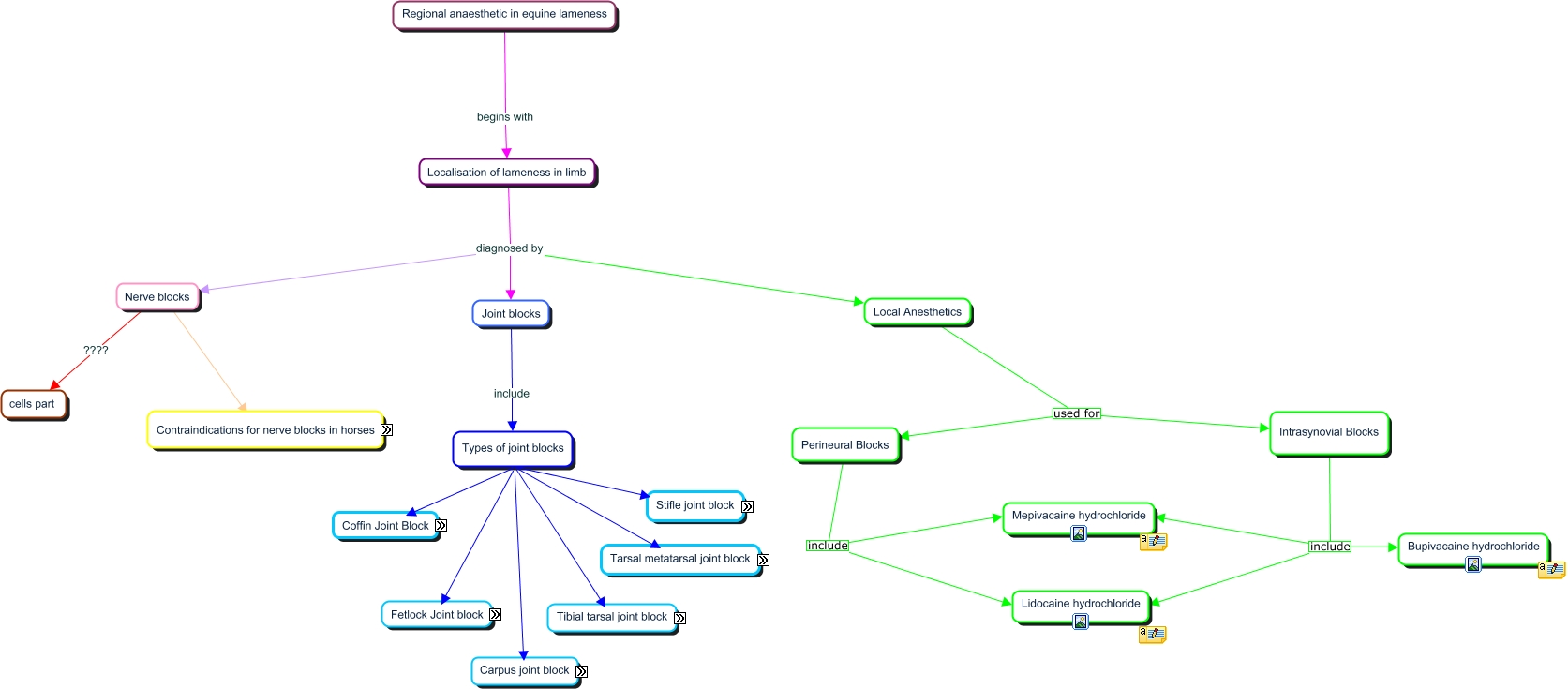 This Concept Map, created with IHMC CmapTools, has information related to: Contraindications for Nerve Blocks. - LJacob, Types of joint blocks Stifle joint block, Contraindications for Nerve Blocks in horses Includes Joint infections, Regional anaesthetic in equine lameness begins with Localisation of lameness in limb, Perineural Blocks include Lidocaine hydrochloride, Perineural Blocks include Mepivacaine hydrochloride, Contraindications for Nerve Blocks in horses Includes Expense, tibial tarsal joint block What do you need? 1.5" 20 G 10-20cc Procedure: Dorsal medial aspect of the hock, the joint is palpated and the needle is inserted directly inwards. Structures blocked: Tibal tarsal itself, proximal intertarsal joint., Stifle joint block What do we need? 1.5" 18G ᡌcc Procedure: 1. Medial femoral tibia- needle is inserted in between the medial patellar ligament and medial collateral ligament, proximal to the tibial tuberosity. Avoid vessels. 2. Femoral Patellar- needle is inserted in between the medial and middle patellar ligament proximal to tibial tuberosity. Needle is angled towards suprapatellar recess 3. lateral femoral tibial- needle is inserted caudal to the lateral collateral ligament proximal to proximal lateral edge of the tibia, Local Anesthetics used for Perineural Blocks, Local Anesthetics used for Intrasynovial Blocks, Types of joint blocks Tarsal metatarsal joint block, Nerve blocks ????, Intrasynovial Blocks include Bupivacaine hydrochloride, Intrasynovial Blocks include Mepivacaine hydrochloride, Contraindications for Nerve Blocks in horses Includes Poor response in the animal, Tarsal metatarsal joint block What do you need? 1.5" 20G needle 3-5cc Procedure: Injected on the plantar lateral aspect of the hock, needle is inserted immediately above the head of the lateral splint bone, needle is angled in a dorsal medial and distal direction, Types of joint blocks Carpus joint block- seen in race horses that have arthritis, Types of joint blocks coffin joint block- common site of lameness found in young thoroughbred horses, Contraindications for Nerve Blocks in horses Includes Articular cartilage degeneration, Localisation of lameness in limb diagnosed by Local Anesthetics