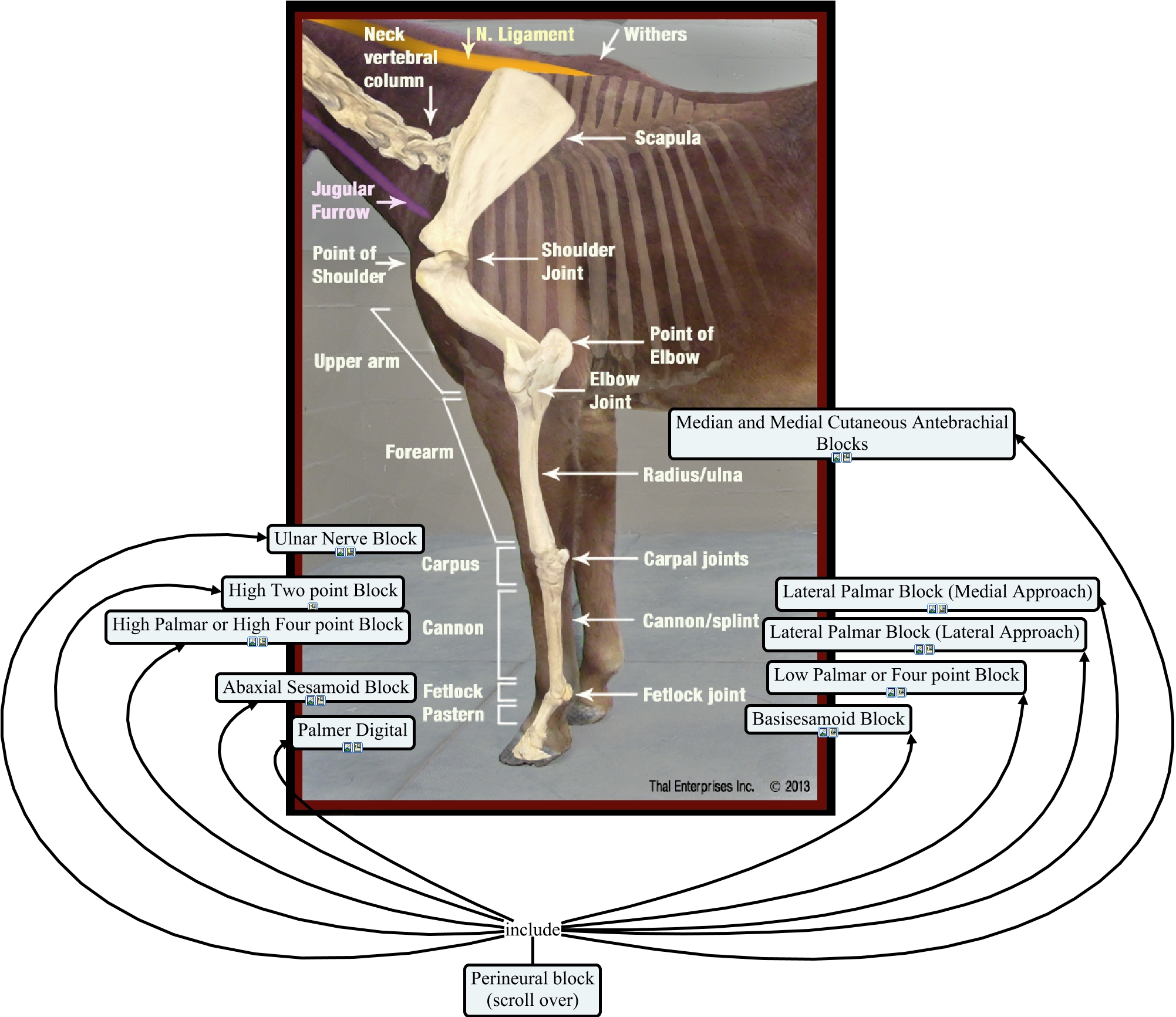 This Concept Map, created with IHMC CmapTools, has information related to: Equine Perineural Block- Forelimb, Perineural block (scroll over) include High Palmar or High Four point Block, Perineural block (scroll over) include Basisesamoid Block, Perineural block (scroll over) include Abaxial Sesamoid Block, Perineural block (scroll over) include High Two point Block, Perineural block (scroll over) include Median and Medial Cutaneous Antebrachial Blocks, Perineural block (scroll over) include Lateral Palmar Block (Lateral Approach), Perineural block (scroll over) include Low Palmar or Four point Block, Perineural block (scroll over) include Lateral Palmar Block (Medial Approach), Perineural block (scroll over) include Palmer Digital, Perineural block (scroll over) include Ulnar Nerve Block
