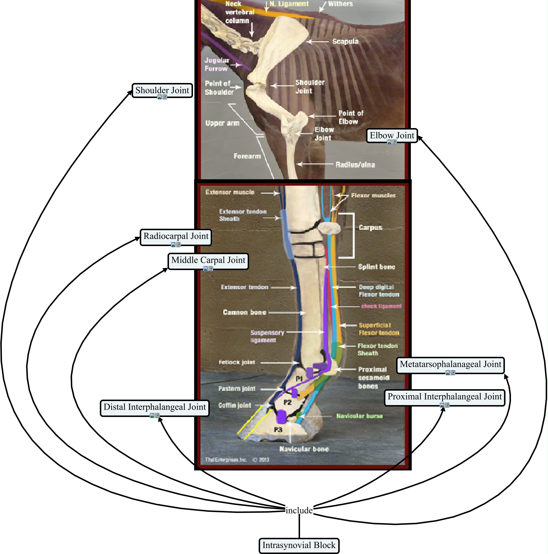 This Concept Map, created with IHMC CmapTools, has information related to: Equine Intrasynovial Blocks- Fore Limb, Intrasynovial Block include Middle Carpal Joint, Intrasynovial Block include Elbow Joint, Intrasynovial Block include Distal Interphalangeal Joint, Intrasynovial Block include Proximal Interphalangeal Joint, Intrasynovial Block include Shoulder Joint, Intrasynovial Block include Radiocarpal Joint, Intrasynovial Block include Metatarsophalanageal Joint