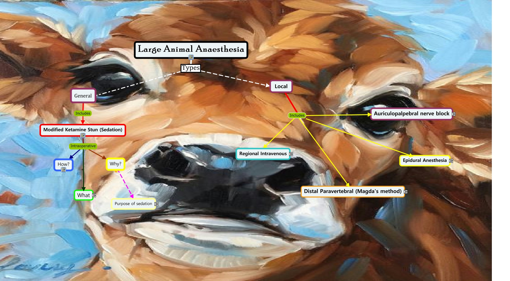 This Concept Map, created with IHMC CmapTools, has information related to: lab 3, Auriculopalpebral Intra-operative How?, Distal Paravertebral (Magda's method) Intra-operative Why?, Distal Paravertebral (Magda's method) Intra-operative How?, Modified Ketamine Stun (Sedation) Intraoperative What?, Hindlimb consider... How?, What? Drugs used, What? Procedure, Auriculopalpebral Intra-operative What?, Hindlimb consider... Why?, Why? Purpose of sedation, Local Includes Distal Paravertebral (Magda's method), Large Animal Anaesthesia Types Local, Modified Ketamine Stun (Sedation) Intraoperative Why?, Epidural Anesthesia Intraoperative Why?, Forelimb consider... Why?, Local Includes Auriculopalpebral, Forelimb consider... What?, Distal Paravertebral (Magda's method) Intra-operative What?, Epidural Anesthesia Intraoperative What?, Local Includes Regional Intravenous