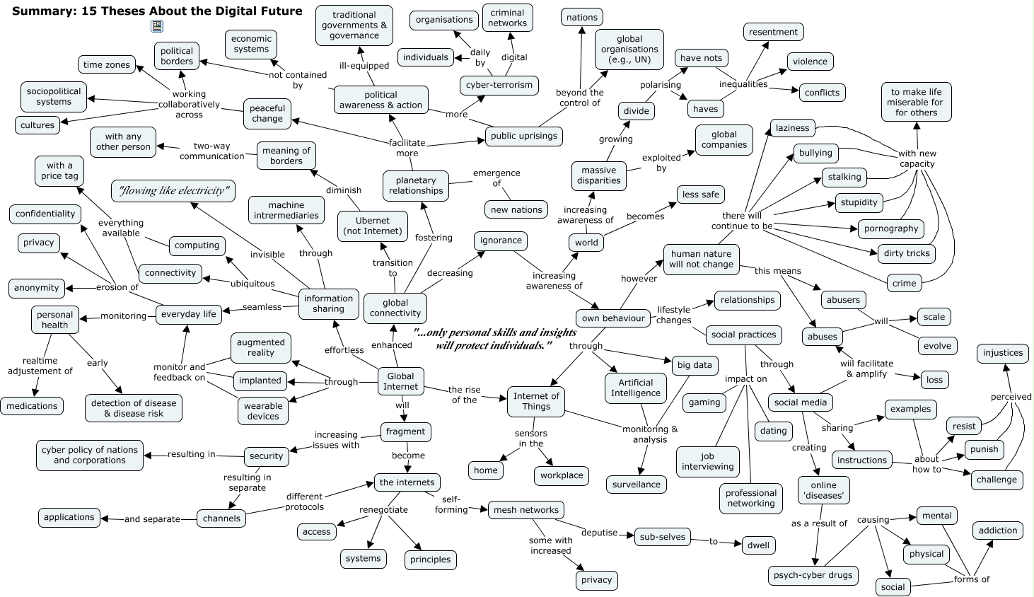 This Concept Map, created with IHMC CmapTools, has information related to: Pew Reports, peaceful change working collaboratively across time zones, human nature will not change there will continue to be bullying, social practices impact on job interviewing, planetary relationships facilitate more political awareness & action, everyday life erosion of confidentiality, world increasing awareness of massive disparities, social media wiil facilitate & amplify loss, own behaviour through big data, everyday life erosion of anonymity, Internet of Things sensors in the workplace, personal health realtime adjustement of medications, own behaviour lifestyle changes relationships, cyber-terrorism digital criminal networks, human nature will not change this means abusers, haves inequalities violence, information sharing through machine intrermediaries, public uprisings more cyber-terrorism, psych-cyber drugs causing mental, examples about how to punish, mental forms of addiction