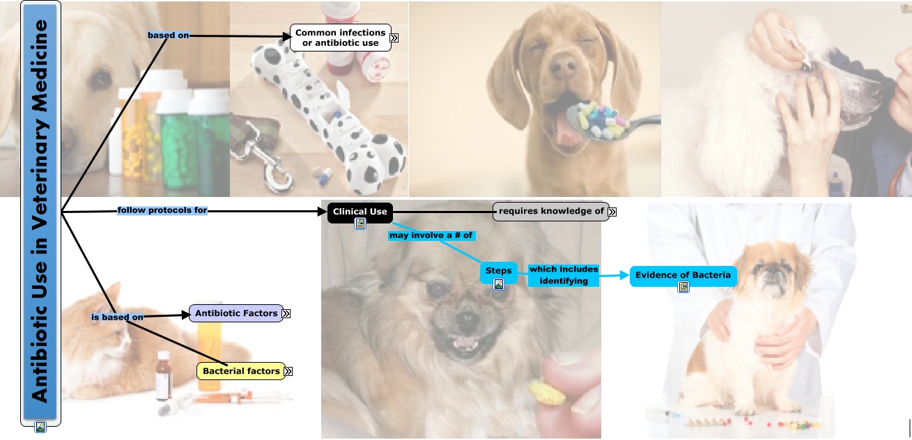 This Concept Map, created with IHMC CmapTools, has information related to: Antibiotic use in Veterinary medicine, based on Common infections or antibiotic use, Antibiotic factors depend on the Classification, Bacterial Factors produce sequela Algorithm, is based on Bacterial Factors, Pharmodynamics affects Duration of treatment, Antibiotic Selection for Prophylaxis, Antibiotic factors include Pharmodynamics, Common infections or antibiotic use in Dog/ cat, Steps which includes identifying Evidence of Bacteria, Clinical Use may involve a # of Steps, follow protocols for Clinical Use, Common infections or antibiotic use in Ruminants, is based on Antibiotic factors, Clinical Use requires knowledge of Interfering factors, Clinical Use requires knowledge of Normal bacterial flora, Normal bacterial flora which is not applicable in Sterile diseases, Bacterial Factors include Bacterial culture and susceptibility, Common infections or antibiotic use in Horse, Clinical Use requires knowledge of Empirical first line use, Pharmokinetics affects Duration of treatment